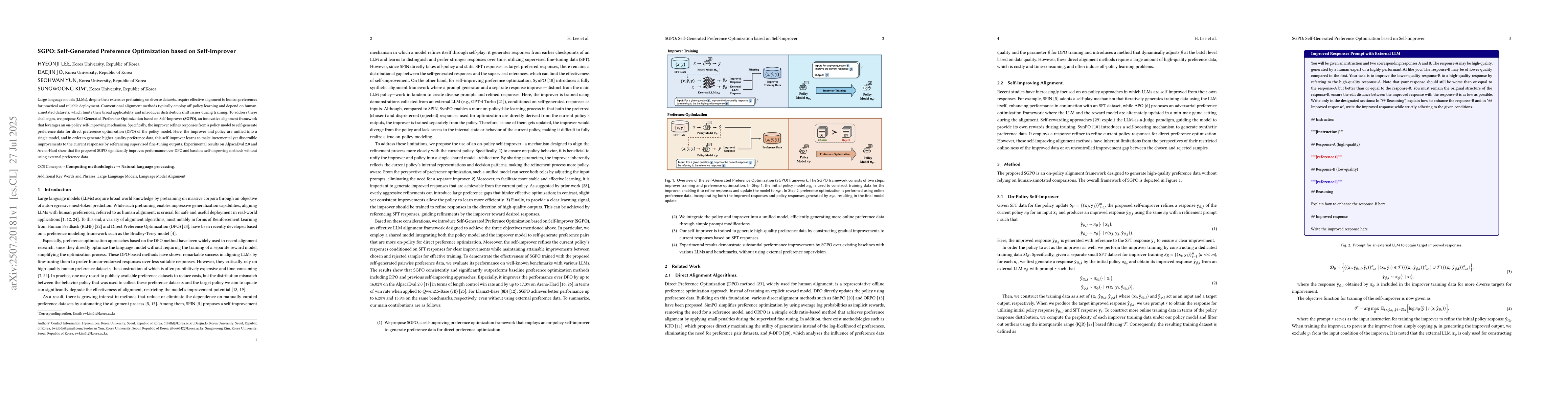 Large language models (LLMs), despite their extensive pretraining on diverse datasets, require effective alignment to human preferences for practical and reliable deployment. Conventional alignment methods typically employ off-policy learning and depend on human-annotated datasets, which limits their broad applicability and introduces distribution shift issues during training. To address these challenges, we propose Self-Generated Preference Optimization based on Self-Improver (SGPO), an innovative alignment framework that leverages an on-policy self-improving mechanism. Specifically, the improver refines responses from a policy model to self-generate preference data for direct preference optimization (DPO) of the policy model. Here, the improver and policy are unified into a single model, and in order to generate higher-quality preference data, this self-improver learns to make incremental yet discernible improvements to the current responses by referencing supervised fine-tuning outputs. Experimental results on AlpacaEval 2.0 and Arena-Hard show that the proposed SGPO significantly improves performance over DPO and baseline self-improving methods without using external preference data.