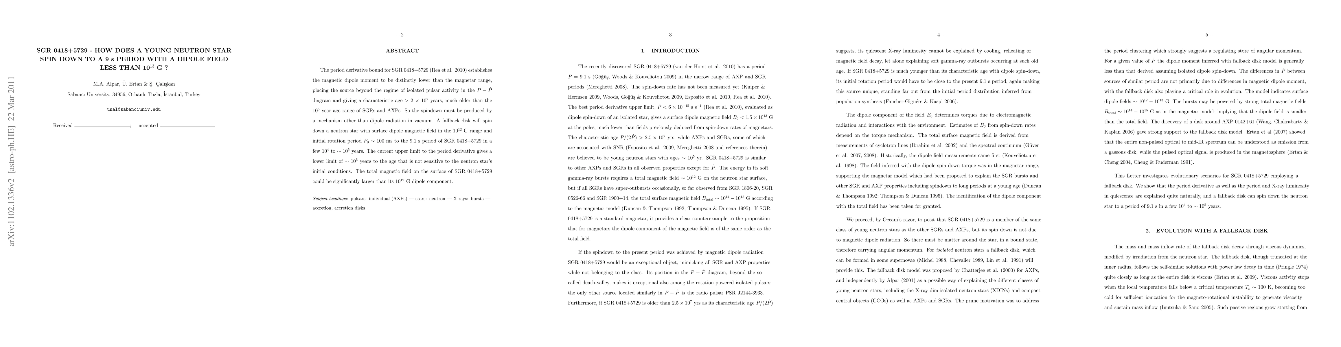 The period derivative bound for SGR 0418+5729 (Rea et al. 2010) establishes the magnetic dipole moment to be distinctly lower than the magnetar range, placing the source beyond the regime of isolated pulsar activity in the P - dP/dt diagram and giving a characteristic age > 2 \times 10^{7} years, much older than the 10^5 year age range of SGRs and AXPs. So the spindown must be produced by a mechanism other than dipole radiation in vacuum. A fallback disk will spin down a neutron star with surface dipole magnetic field in the 10^{12} G range and initial rotation period P_0 ~ 100 ms to the 9.1 s period of SGR 0418+5729 in a few 10^4 to ~10^5 years. The current upper limit to the period derivative gives a lower limit of \sim 10^5 years to the age that is not sensitive to the neutron star's initial conditions. The total magnetic field on the surface of SGR 0418+5729 could be significantly larger than its 10^{12} G dipole component.