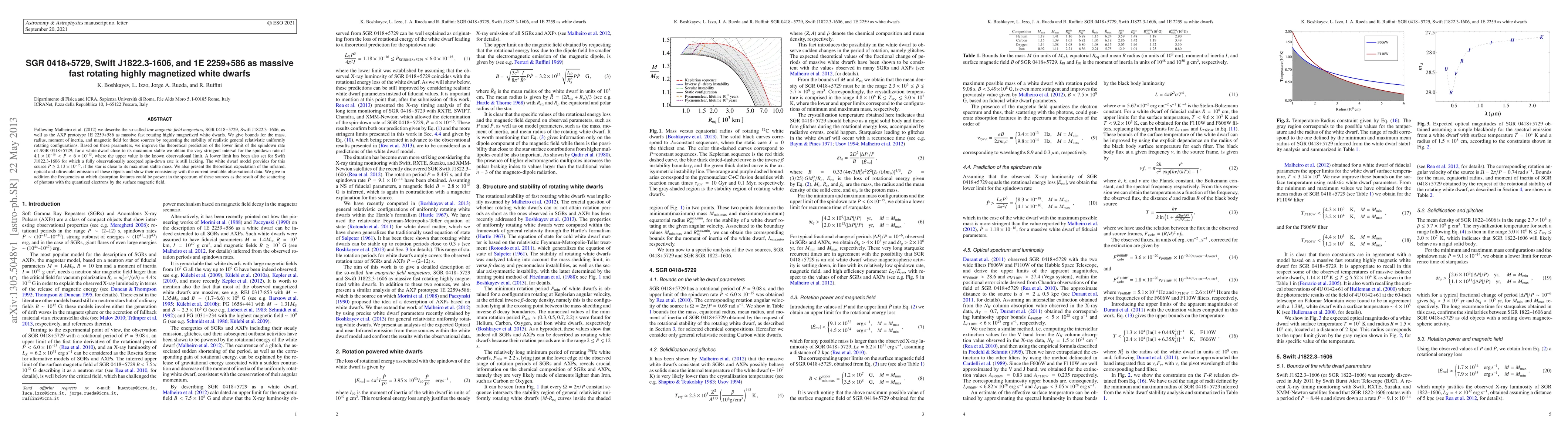 This paper proposes that SGR 0418+5729, Swift J1822.3-1606, and 1E 2259+586 are massive, fast rotating, highly magnetized white dwarfs. The authors derive mass, radius, moment of inertia, and magnetic field bounds for these objects, predicting specific spindown rates and spectral features consistent with observational data.