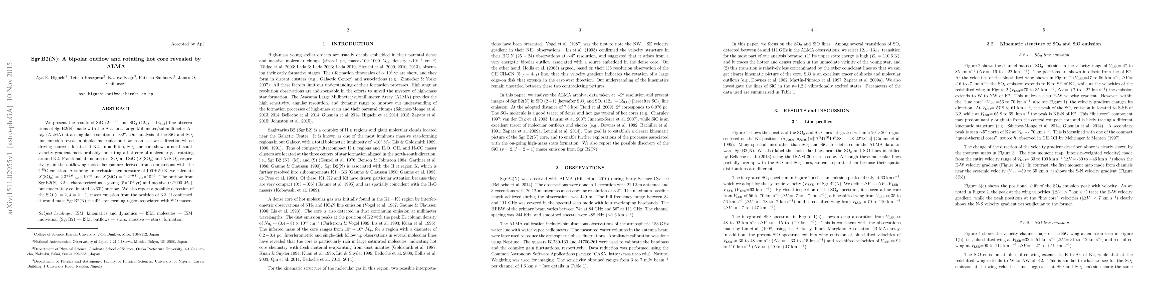 ALMA observations of Sgr B2(N) reveal a bipolar molecular outflow and a rotating hot core around K2, with derived fractional abundances of SO2 and SiO in the outflow. The outflow is young, massive, and moderately collimated.