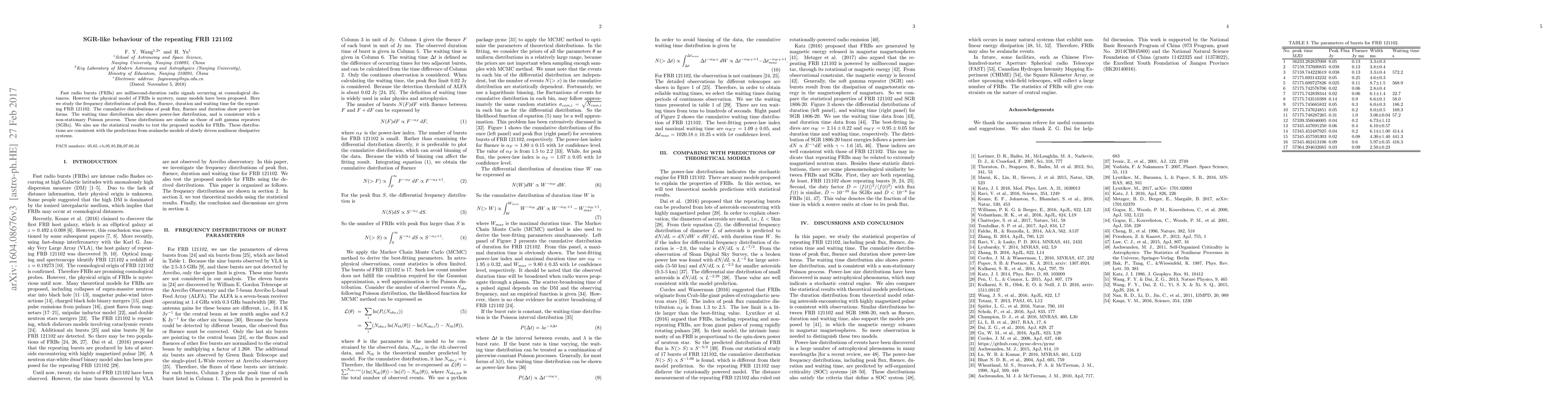 This paper investigates the frequency distributions of the repeating fast radio burst (FRB) 121102, finding that they resemble those of soft gamma repeaters (SGRs). The study supports avalanche models of nonlinear dissipative systems for explaining FRBs.