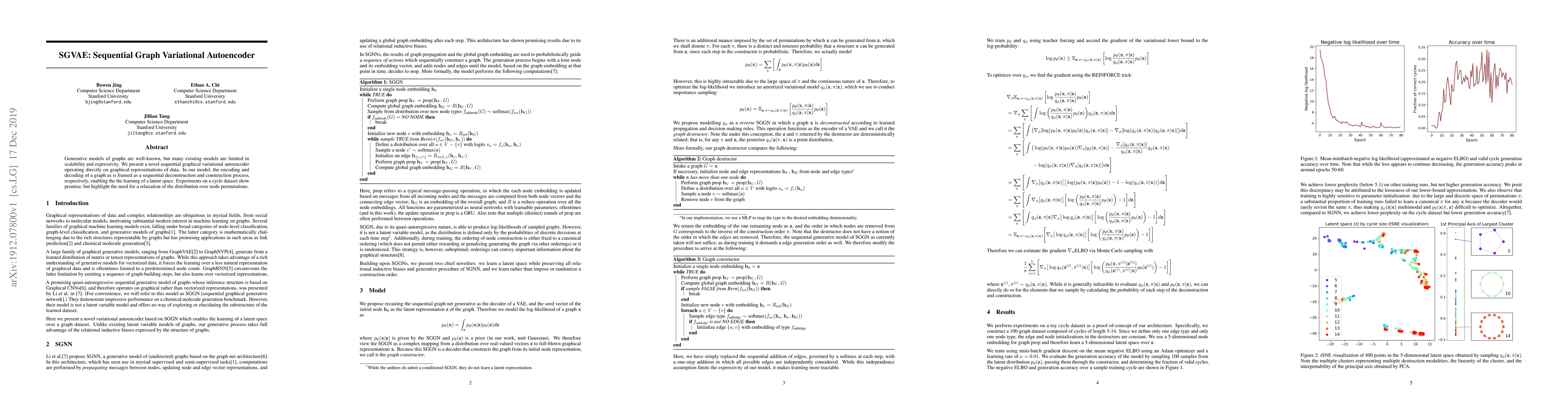 The SGVAE model introduces a scalable and expressive sequential graphical variational autoencoder for generating graph data, employing a sequential deconstruction-construction approach. Initial experiments on a cycle dataset show potential, though the model requires further refinement in handling node permutations.