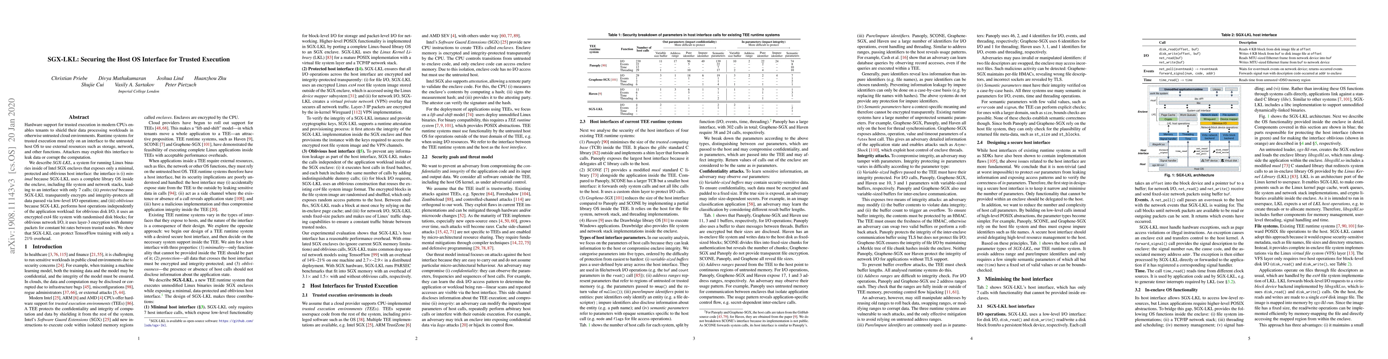 SGX-LKL secures the interface between Intel SGX enclaves and the untrusted host OS by exposing only a minimal, encrypted, and integrity-protected interface with just 7 calls, ensuring oblivious disk I/O and protecting data processing workloads in cloud environments. It demonstrates a 21% overhead with TensorFlow training.