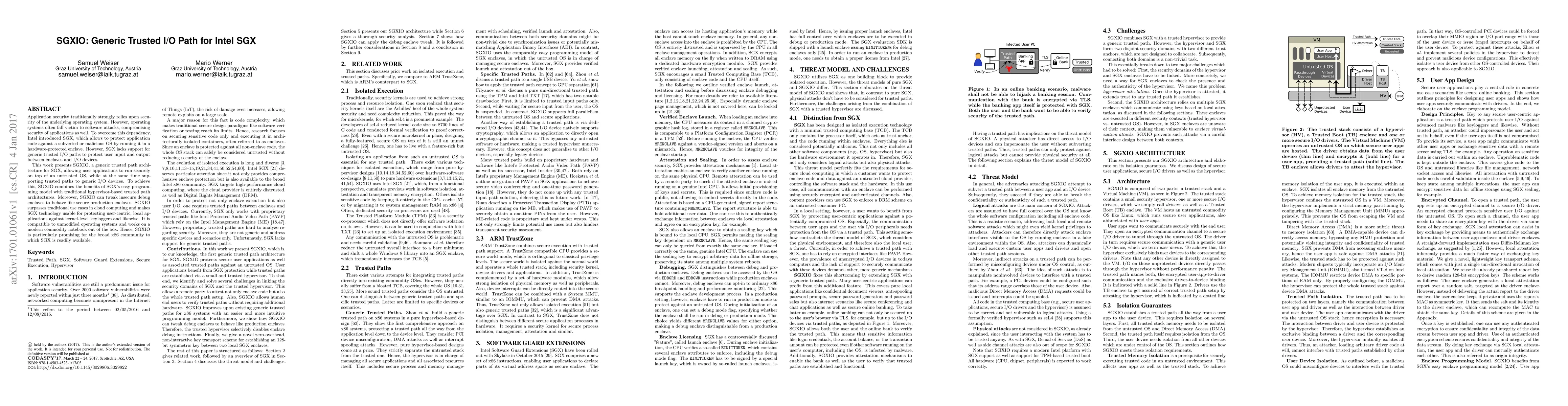 SGXIO provides a generic trusted I/O path for Intel SGX, enabling secure execution of applications on untrusted OS while protecting user input and output to I/O devices, thus broadening the usability of SGX for local applications against kernel-level threats. It combines SGX's simplicity with traditional trusted path architectures, working seamlessly with unmodified operating systems.