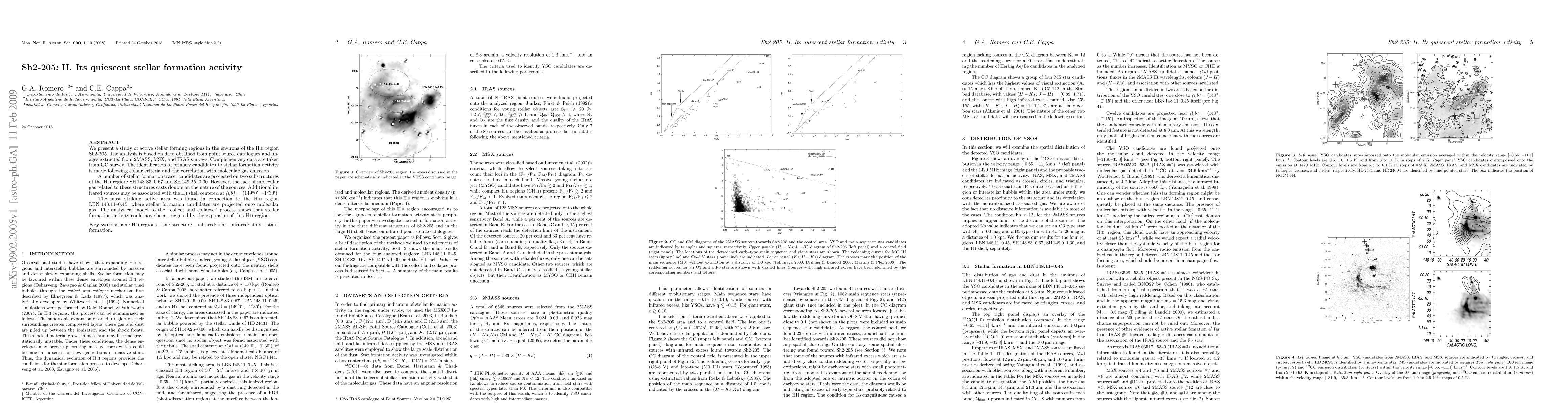 We present a study of active stellar forming regions in the environs of the HII region Sh2-205. The analysis is based on data obtained from point source catalogues and images extracted from 2MASS, MSX, and IRAS surveys. Complementary data are taken from CO survey. The identification of primary candidates to stellar formation activity is made following colour criteria and the correlation with molecular gas emission. A number of stellar formation tracer candidates are projected on two substructures of the HII region: SH148.83-0.67 and SH149.25-0.00. However, the lack of molecular gas related to these structures casts doubts on the nature of the sources. Additional infrared sources may be associated with the HI shell centered at (l,b) = (149\degr 0\arcmin, -1\degr 30\arcmin). The most striking active area was found in connection to the HII region LBN 148.11-0.45, where stellar formation candidates are projected onto molecular gas. The analytical model to the "collect and collapse" process shows that stellar formation activity could have been triggered by the expansion of this HII region.