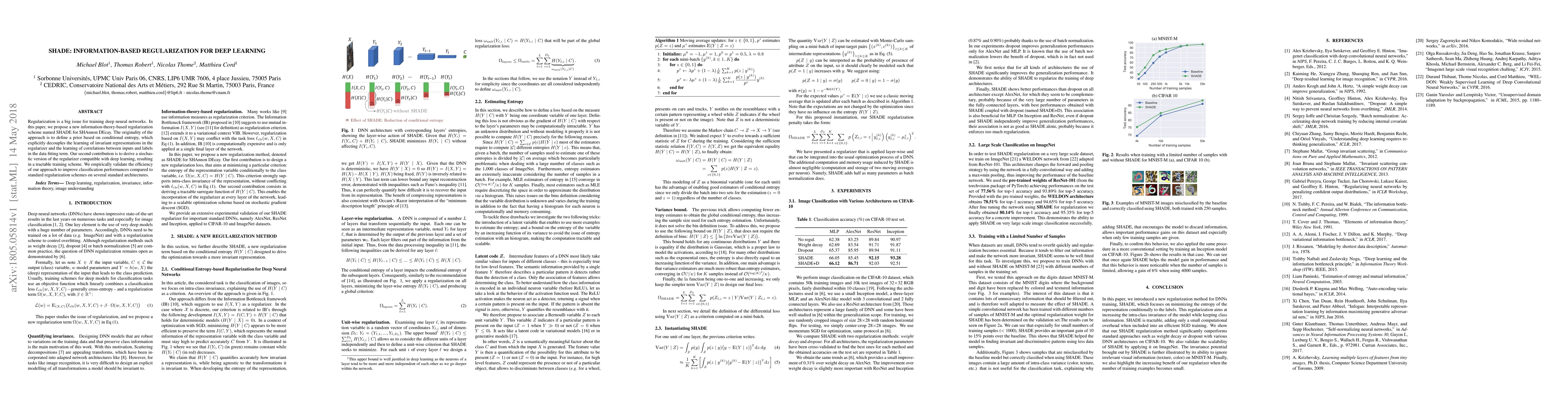 This paper introduces SHADE, an information-theory-based regularization scheme for deep learning that uses conditional entropy to decouple invariant representation learning from data fitting. A stochastic version of the regularizer is also proposed, which improves classification performance over standard methods.