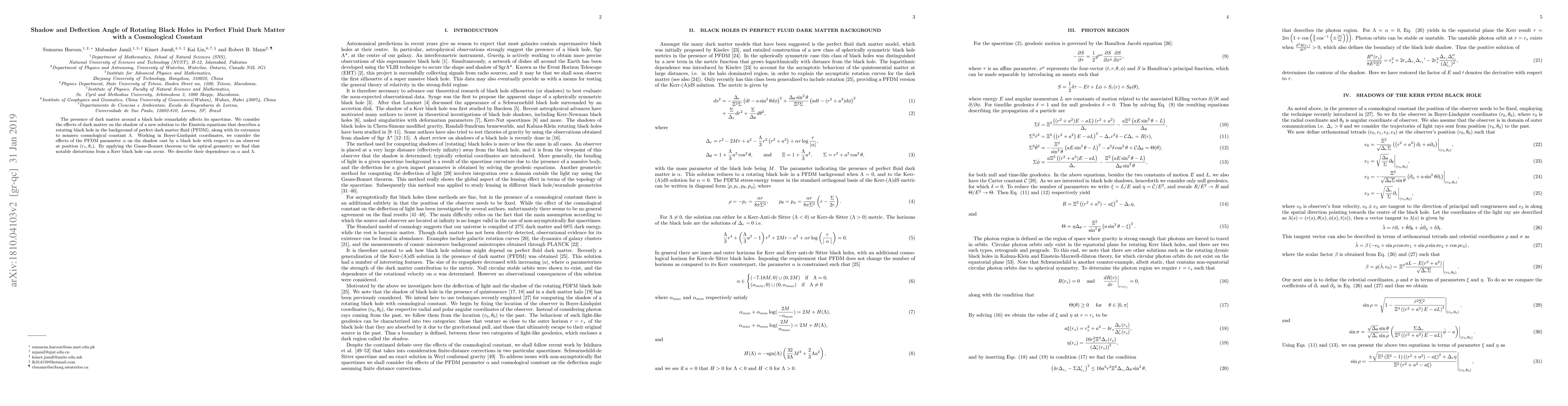 The presence of dark matter around a black hole remarkably affects its spacetime. We consider the effects of dark matter on the shadow of a new solution to the Einstein equations that describes a rotating black hole in the background of perfect dark matter fluid (PFDM), along with its extension to nonzero cosmological constant $\Lambda$. Working in Boyer-Lindquist coordinates, we consider the effects of the PFDM parameter $\alpha$ on the shadow cast by a black hole with respect to an observer at position $(r_o,\theta_o)$. By applying the Gauss-Bonnet theorem to the optical geometry we find that notable distortions from a Kerr black hole can occur. We describe their dependence on $\alpha$ and $\Lambda$.