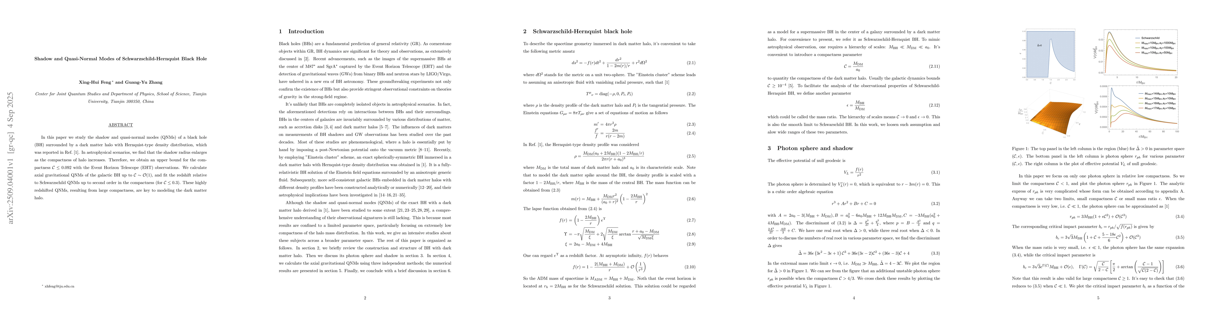 In this paper we study the shadow and quasi-normal modes (QNMs) of a black hole (BH) surrounded by a dark matter halo with Hernquist-type density distribution, which was reported in Ref. \cite{Cardoso:2021wlq}. In astrophysical scenarios, we find that the shadow radius enlarges as the compactness of halo increases. Therefore, we obtain an upper bound for the compactness ${\cal C}\le0.092$ with the Event Horizon Telescope (EHT) observations. We calculate axial gravitational QNMs of the galactic BH up to ${\cal C}\sim{\cal O}(1)$, and fit the redshift relative to Schwarzschild QNMs up to second order in the compactness (for ${\cal C}\le0.3)$. These highly redshifted QNMs, resulting from large compactness, are key to modeling the dark matter halo.