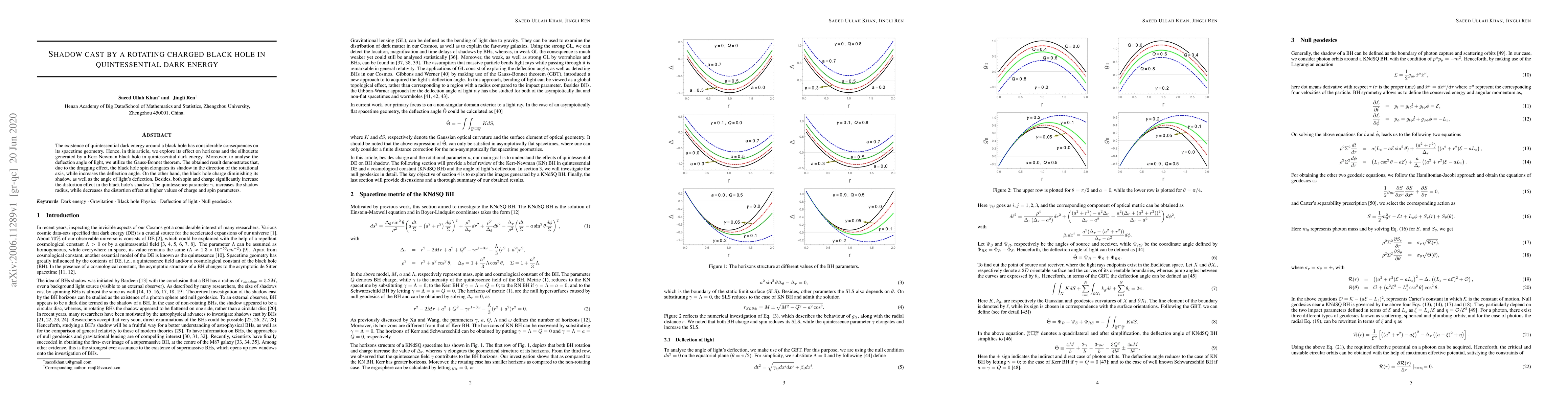 The existence of quintessential dark energy around a black hole has considerable consequences on its spacetime geometry. Hence, in this article, we explore its effect on horizons and the silhouette generated by a Kerr-Newman black hole in quintessential dark energy. Moreover, to analyze the deflection angle of light, we utilize the Gauss-Bonnet theorem. The obtained result demonstrates that, due to the dragging effect, the black hole spin elongates its shadow in the direction of the rotational axis, while increases the deflection angle. On the other hand, the black hole charge diminishing its shadow, as well as the angle of lights deflection. Besides, both spin and charge significantly increase the distortion effect in the black hole's shadow. The quintessence parameter \gamma, increases the shadow radius, while decreases the distortion effect at higher values of charge and spin parameters.