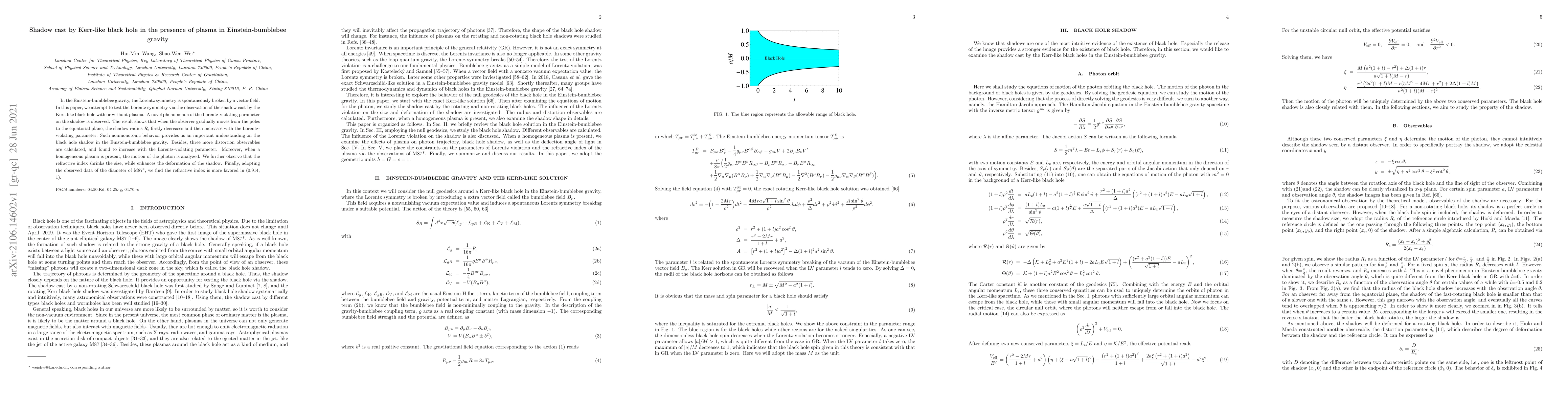 Researchers investigated how a black hole's shadow behaves in Einstein-bumblebee gravity with plasma present, finding that the shadow's size changes nonmonotonically with a parameter related to Lorentz symmetry breaking.