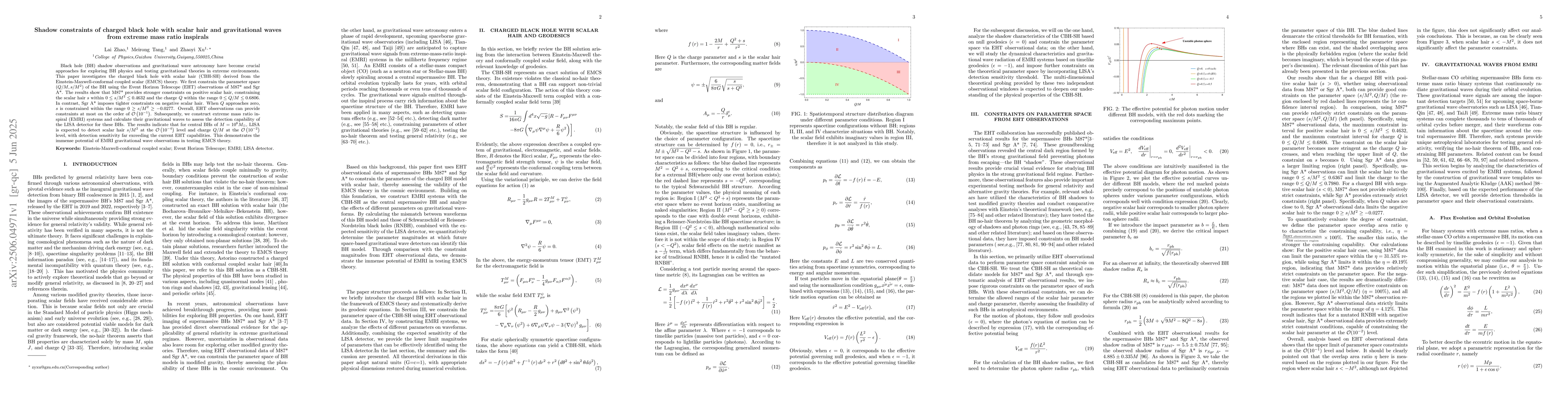 Black hole (BH) shadow observations and gravitational wave astronomy have become crucial approaches for exploring BH physics and testing gravitational theories in extreme environments. This paper investigates the charged black hole with scalar hair (CBH-SH) derived from the Einstein-Maxwell-conformal coupled scalar (EMCS) theory. We first constrain the parameter space $(Q/M, s/M^2)$ of the BH using the Event Horizon Telescope (EHT) observations of M87* and Sgr A*. The results show that M87* provides stronger constraints on positive scalar hair, constraining the scalar hair $s$ within $0\le s/M^2\le0.4632$ and the charge $Q$ within the range $0\le Q/M\le0.6806$. In contrast, Sgr A* imposes tighter constraints on negative scalar hair. When $Q$ approaches zero, $s$ is constrained within the range $0\geq s/M^2\geq-0.0277$. Overall, EHT observations can provide constraints at most on the order of $\mathcal{O}\left({10}^{-1}\right)$. Subsequently, we construct extreme mass ratio inspiral (EMRI) systems and calculate their gravitational waves to assess the detection capability of the LISA detector for these BHs. The results indicate that for central BHs of $M={10}^6M_\odot$, LISA is expected to detect scalar hair $s/M^2$ at the $\mathcal{O}\left({10}^{-4}\right)$ level and charge $Q/M$ at the $\mathcal{O}\left({10}^{-2}\right)$ level, with detection sensitivity far exceeding the current EHT capabilities. This demonstrates the immense potential of EMRI gravitational wave observations in testing EMCS theory.