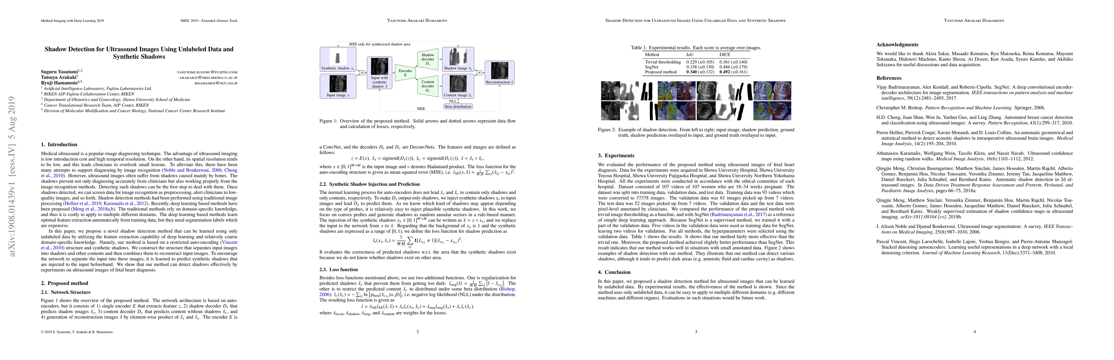 This paper proposes a novel shadow detection method for ultrasound images using an auto-encoding structure that separates shadows from content without labeled data. Synthetic shadows are used to train the network, demonstrating effectiveness in fetal heart diagnosis.