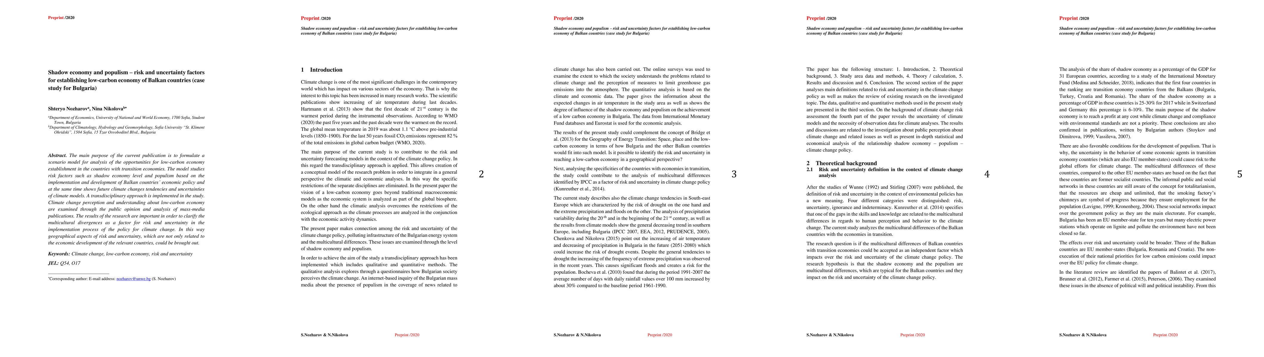 The main purpose of the current publication is to formulate a scenario model for analysis of the opportunities for low-carbon economy establishment in the countries with transition economies.The model studies risk factors such as shadow economy level and populism based on the implementation and development of Balkan countries economic policy and at the same time shows future climate changes tendencies and uncertainties of climate models.A transdisciplinary approach is implemented in the study. Climate change perception and understanding about low-carbon economy are examined through the public opinion and analysis of mass-media publications.The results of the research are important in order to clarify the multicultural divergences as a factor for risk and uncertainty in the implementation process of the policy for climate change.In this way geographical aspects of risk and uncertainty, which are not only related to the economic development of the relevant countries, could be brought out.