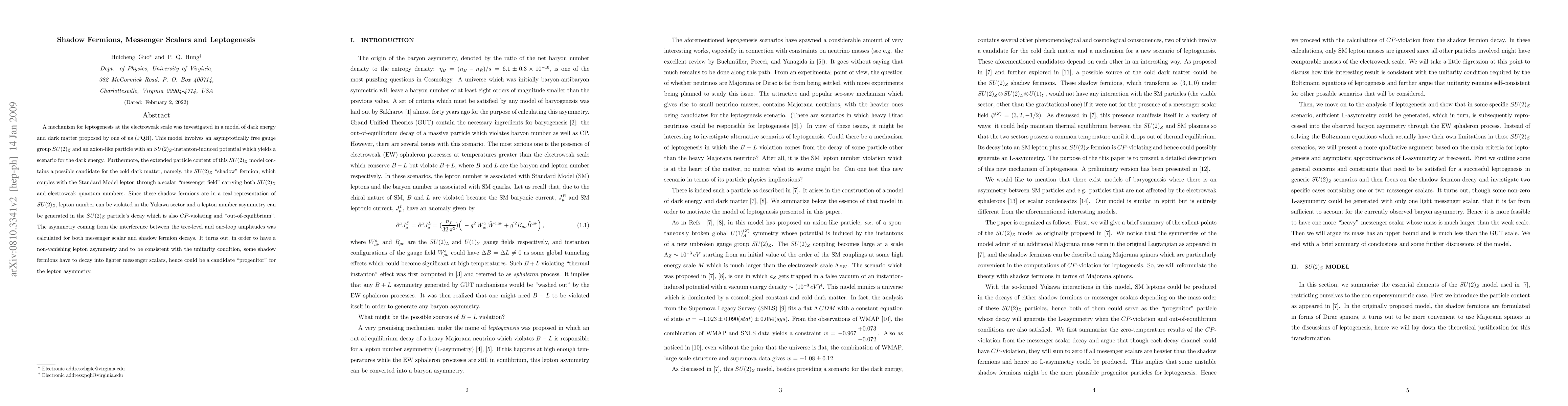 A mechanism for leptogenesis at the electroweak scale was investigated in a model of dark energy and dark matter proposed by one of us (PQH). This model involves an asymptotically free gauge group SU(2)Z and an axion-like particle with an SU(2)Z-instanton-induced potential which yields a scenario for the dark energy. Furthermore, the extended particle content of this SU(2)Z model contains a possible candidate for the cold dark matter, namely, the SU(2)Z "shadow" fermion, which couples with the Standard Model lepton through a scalar "messenger field" carrying both SU(2)Z and electroweak quantum numbers. Since these shadow fermions are in a real representation of SU(2)Z, lepton number can be violated in the Yukawa sector and a lepton number asymmetry can be generated in the SU(2)Z particle's decay which is also CP-violating and "out-of-equilibrium". The asymmetry coming from the interference between the tree-level and one-loop amplitudes was calculated for both messenger scalar and shadow fermion decays. It turns out, in order to have a non-vanishing lepton asymmetry and to be consistent with the unitarity condition, some shadow fermions have to decay into lighter messenger scalars, hence could be a candidate "progenitor" for the lepton asymmetry.