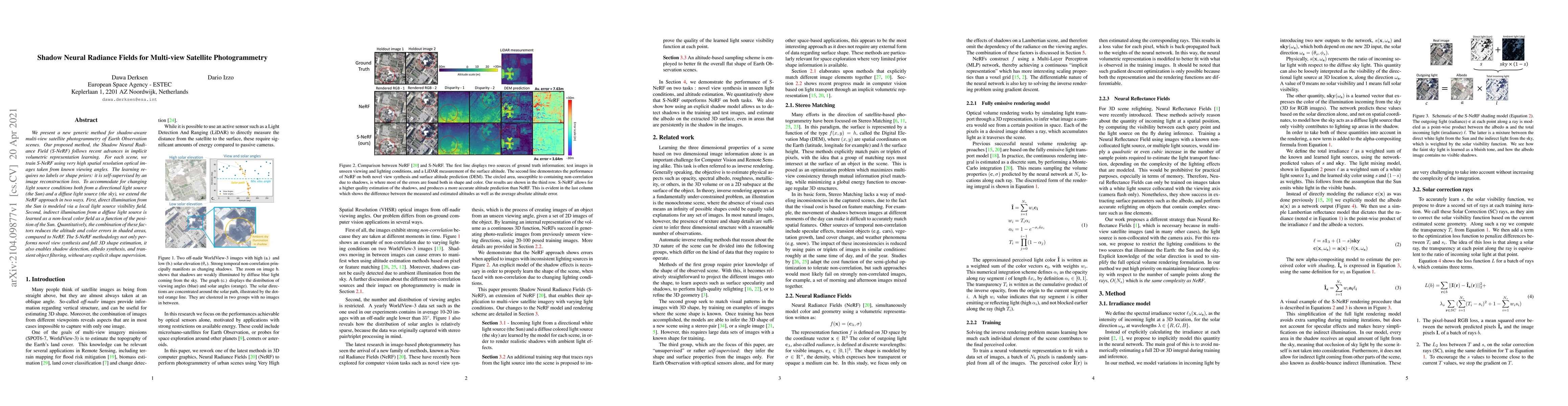 We present a new generic method for shadow-aware multi-view satellite photogrammetry of Earth Observation scenes. Our proposed method, the Shadow Neural Radiance Field (S-NeRF) follows recent advances in implicit volumetric representation learning. For each scene, we train S-NeRF using very high spatial resolution optical images taken from known viewing angles. The learning requires no labels or shape priors: it is self-supervised by an image reconstruction loss. To accommodate for changing light source conditions both from a directional light source (the Sun) and a diffuse light source (the sky), we extend the NeRF approach in two ways. First, direct illumination from the Sun is modeled via a local light source visibility field. Second, indirect illumination from a diffuse light source is learned as a non-local color field as a function of the position of the Sun. Quantitatively, the combination of these factors reduces the altitude and color errors in shaded areas, compared to NeRF. The S-NeRF methodology not only performs novel view synthesis and full 3D shape estimation, it also enables shadow detection, albedo synthesis, and transient object filtering, without any explicit shape supervision.