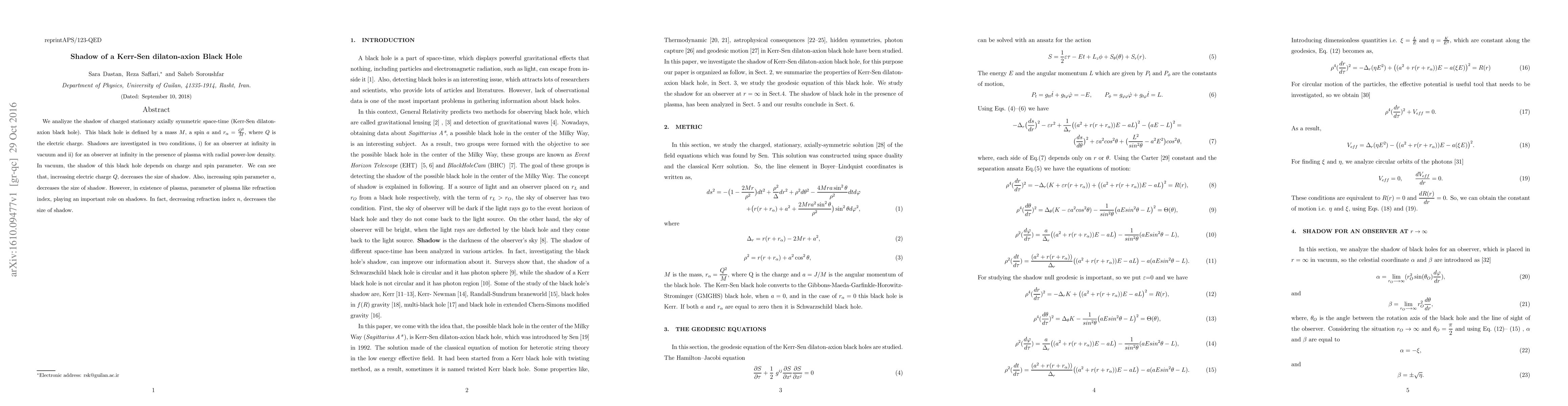 We analyze the shadow of charged stationary axially symmetric space-time (Kerr-Sen dilaton-axion black hole). This black hole is defined by a mass $M$, a spin $a$ and $r_{\alpha}=Q^{2}/M$, where $Q$ is the electric charge. Shadows are investigated in two conditions, i) for an observer at infinity in vacuum and ii) for an observer at infinity in the presence of plasma with radial power-low density. In vacuum, the shadow of this black hole depends on charge and spin parameter. We can see that, increasing electric charge, $Q$ decreases the size of shadow. Also, increasing spin parameter $a$ decreases the size of shadow. However, in existence of plasma, parameter of plasma like refraction index, $n$, playing an important role on shadows. In fact, decreasing refraction index decreases the size of shadow.