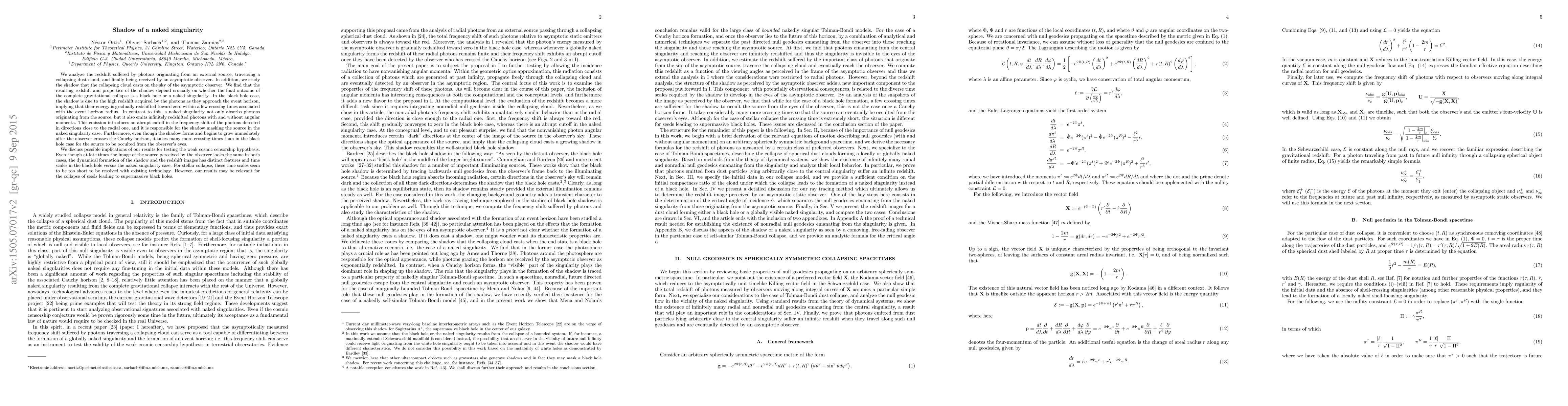This paper investigates the redshift and shadow formation of photons from an external source as they traverse a collapsing dust cloud, finding significant differences in outcomes between black holes and naked singularities. While black holes redshift photons to zero energy near the event horizon, naked singularities emit infinitely redshifted photons, causing an abrupt cutoff in frequency shift and a delayed shadow formation. Implications for testing the weak cosmic censorship hypothesis are discussed.