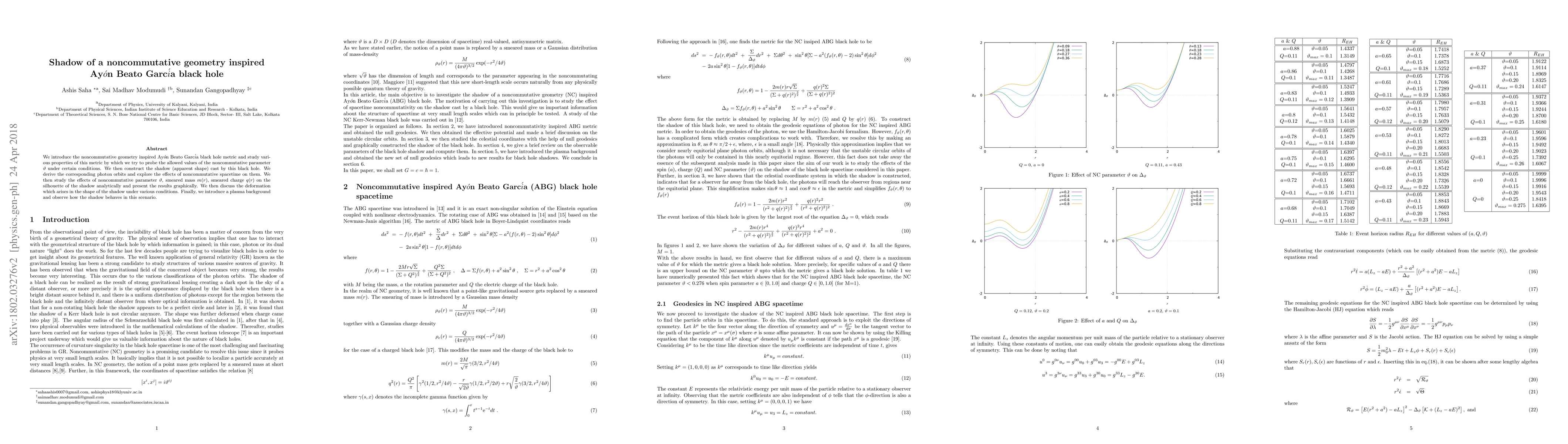 We introduce the noncommutative geometry inspired Ay\'on Beato Garc\'ia black hole metric and study various properties of this metric by which we try to probe the allowed values of the noncommutative parameter $\vartheta$ under certain conditions. We then construct the shadow (apparent shape) cast by this black hole. We derive the corresponding photon orbits and explore the effects of noncommutative spacetime on them. We then study the effects of noncommutative parameter $\vartheta$, smeared mass $m(r)$, smeared charge $q(r)$ on the silhouette of the shadow analytically and present the results graphically. We then discuss the deformation which arises in the shape of the shadow under various conditions. Finally, we introduce a plasma background and observe how the shadow behaves in this scenario.