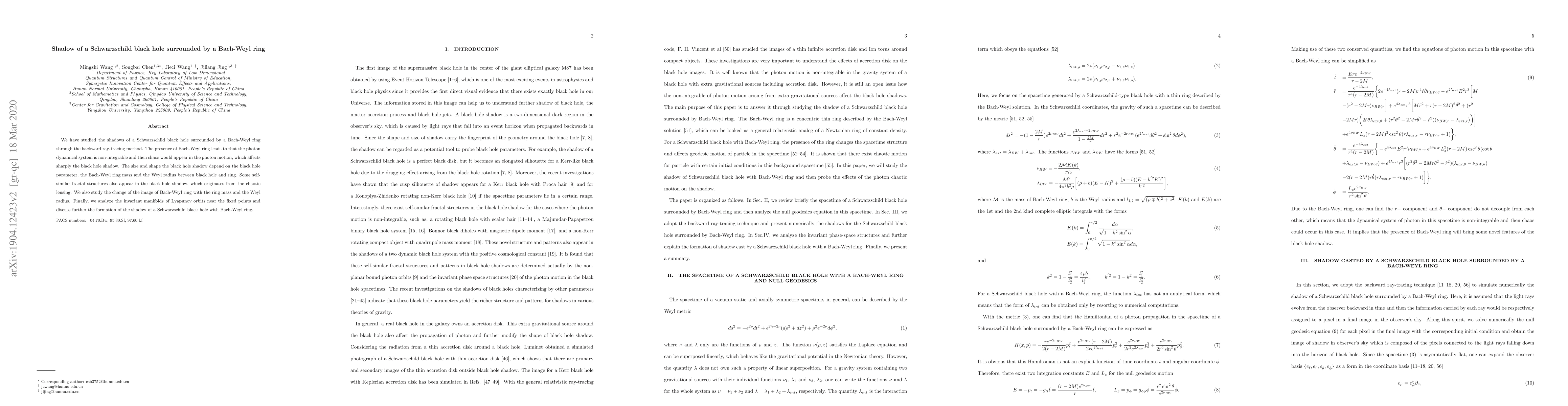 We have studied the shadows of a Schwarzschild black hole surrounded by a Bach-Weyl ring through the backward ray-tracing method. The presence of Bach-Weyl ring leads to that the photon dynamical system is non-integrable and then chaos would appear in the photon motion, which affects sharply the black hole shadow. The size and shape the black hole shadow depend on the black hole parameter, the Bach-Weyl ring mass and the Weyl radius between black hole and ring. Some self-similar fractal structures also appear in the black hole shadow, which originates from the chaotic lensing. We also study the change of the image of Bach-Weyl ring with the ring mass and the Weyl radius. Finally, we analyze the invariant manifolds of Lyapunov orbits near the fixed points and discuss further the formation of the shadow of a Schwarzschild black hole with Bach-Weyl ring.