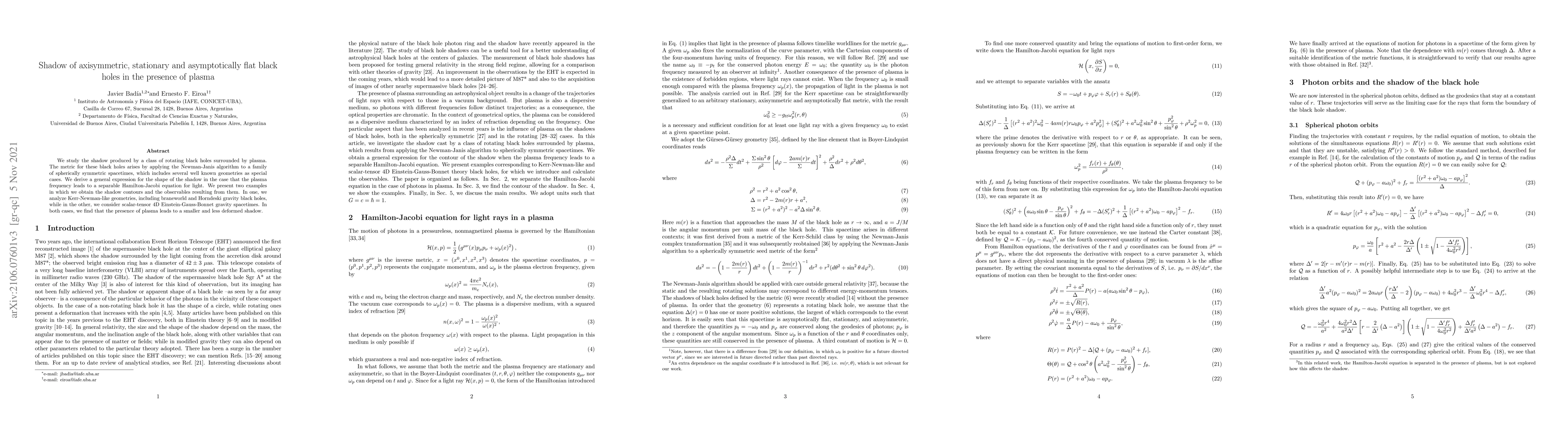 We study the shadow produced by a class of rotating black holes surrounded by plasma. The metric for these black holes arises by applying the Newman-Janis algorithm to a family of spherically symmetric spacetimes, which includes several well known geometries as special cases. We derive a general expression for the shape of the shadow in the case that the plasma frequency leads to a separable Hamilton-Jacobi equation for light. We present two examples in which we obtain the shadow contours and the observables resulting from them. In one, we analyze Kerr-Newman-like geometries, including braneworld and Horndeski gravity black holes, while in the other, we consider scalar-tensor 4D Einstein-Gauss-Bonnet gravity spacetimes. In both cases, we find that the presence of plasma leads to a smaller and less deformed shadow.