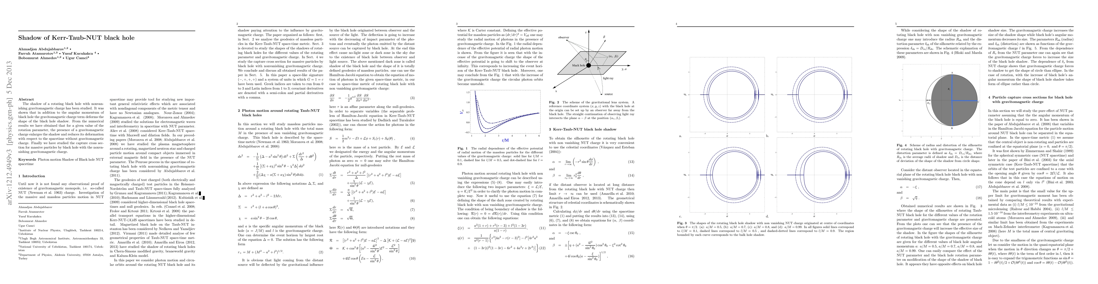 The shadow of a rotating black hole with nonvanishing gravitomagnetic charge is deformed due to the added term, enlarging the shadow size and reducing deformation. This effect also influences massive particle capture cross sections.