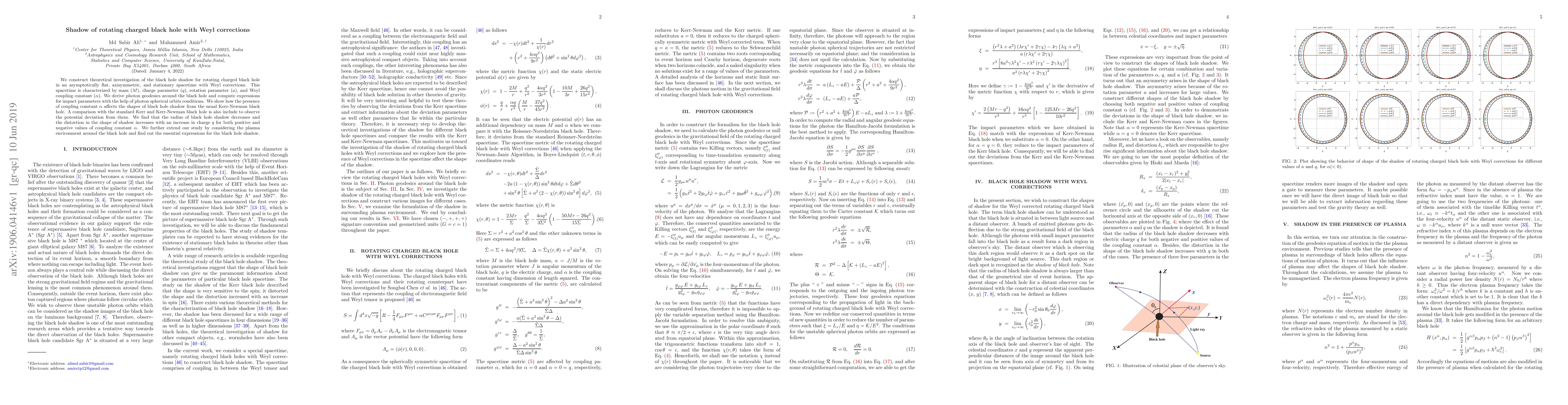 We construct theoretical investigation of the black hole shadow for rotating charged black hole in an asymptotically flat, axisymmetric, and stationary spacetime with Weyl corrections. This spacetime is characterized by mass ($M$), charge parameter ($q$), rotation parameter ($a$), and Weyl coupling constant ($\alpha$). We derive photon geodesics around the black hole and compute expressions for impact parameters with the help of photon spherical orbits conditions. We show how the presence of coupling constant $\alpha$ affects the shapes of black hole shadow from the usual Kerr-Newman black hole. A comparison with the standard Kerr and Kerr-Newman black hole is also include to observe the potential deviation from them. We find that the radius of black hole shadow decreases and the distortion in the shape of shadow increases with an increase in charge $q$ for both positive and negative values of coupling constant $\alpha$. We further extend our study by considering the plasma environment around the black hole and find out the essential expressions for the black hole shadow.