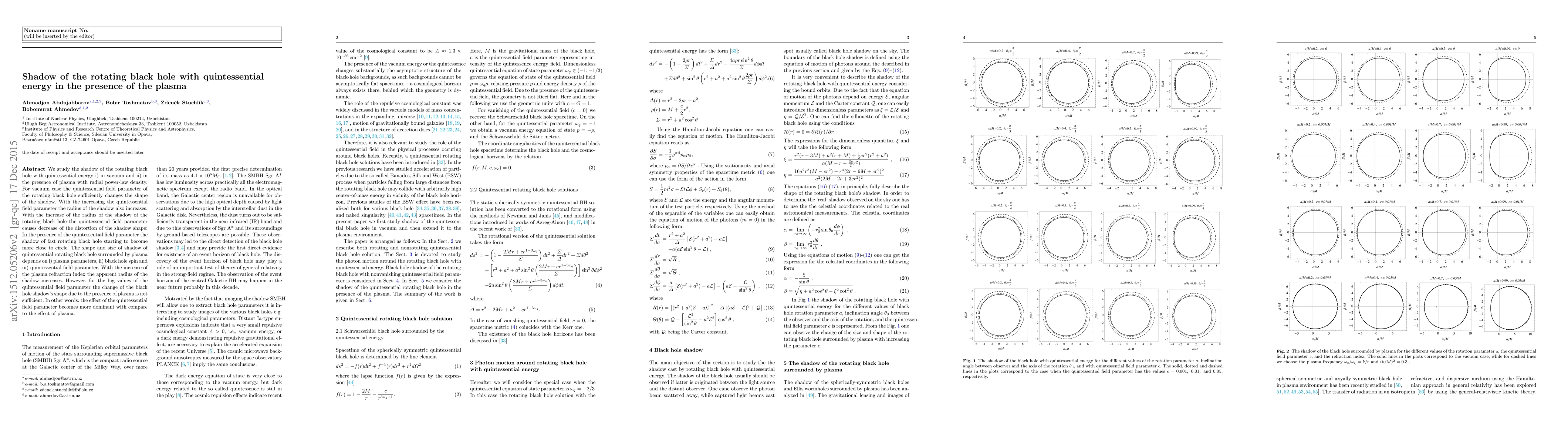 We study the shadow of the rotating black hole with quintessential energy i) in vacuum and ii) in the presence of plasma with radial power-law density. For vacuum case the quintessential field parameter of the rotating black hole sufficiently changes the shape of the shadow. With the increasing the quintessential field parameter the radius of the shadow also increases. With the increase of the radius of the shadow of the rotating black hole the quintessential field parameter causes decrease of the distortion of the shadow shape: In the presence of the quintessential field parameter the shadow of fast rotating black hole starting to become more close to circle. The shape and size of shadow of quintessential rotating black hole surrounded by plasma depends on i) plasma parameters, ii) black hole spin and iii) quintessential field parameter. With the increase of the plasma refraction index the apparent radius of the shadow increases. However, for the big values of the quintessential field parameter the change of the black hole shadow's shape due to the presence of plasma is not sufficient. In other words: the effect of the quintessential field parameter becomes more dominant with compare to the effect of plasma.