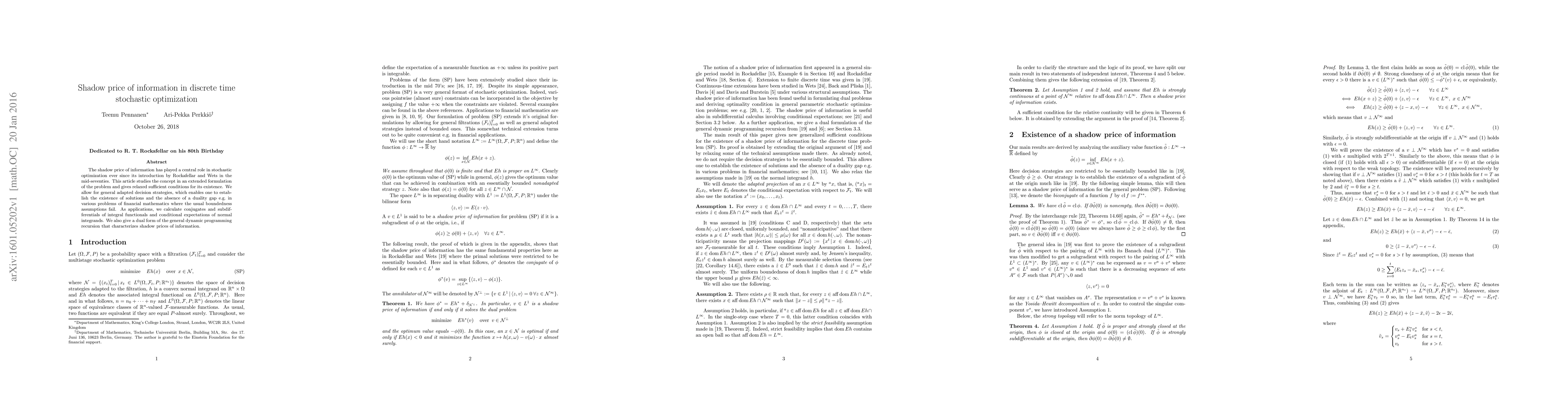 This paper studies the shadow price of information in discrete time stochastic optimization, providing relaxed conditions for its existence and a dual form of dynamic programming recursion. It enables solutions to exist even with unbounded strategies and has implications for financial mathematics applications.