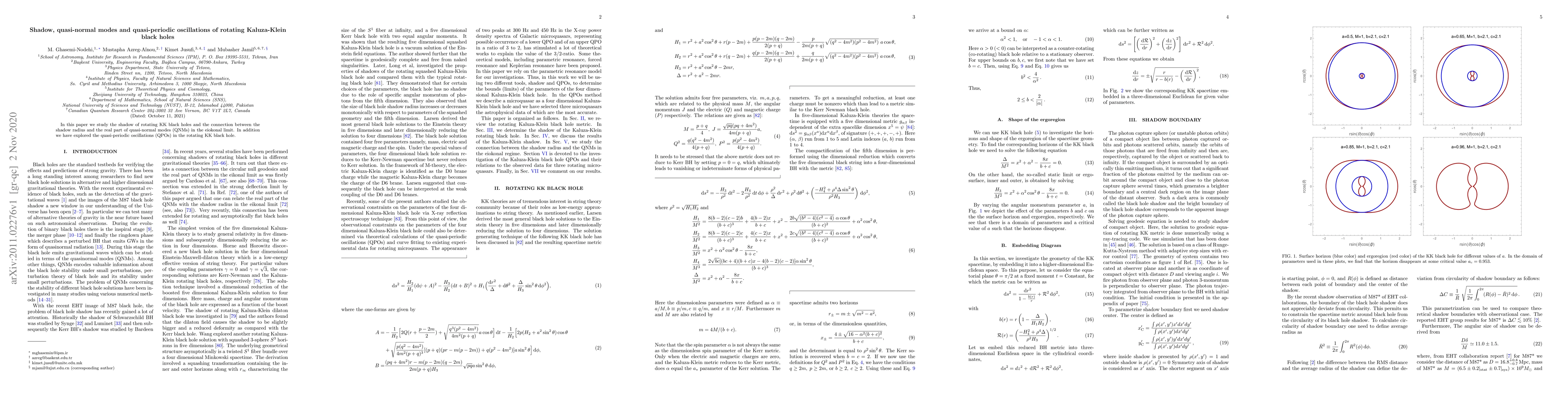 This paper investigates the shadow of rotating Kaluza-Klein black holes and links the shadow radius to the real part of quasi-normal modes in the equatorial limit. It also explores quasi-periodic oscillations in these rotating black holes.