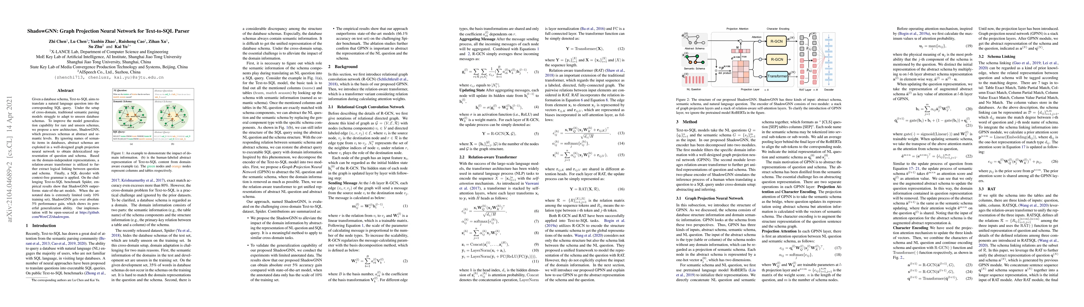 ShadowGNN is a novel graph projection neural network designed to improve text-to-SQL parsing by leveraging abstract schema representations and a relation-aware transformer, achieving superior performance on the Spider benchmark, especially under limited training data. The model's generalization ability is demonstrated by a 5% performance gain with only 10% of the training set.