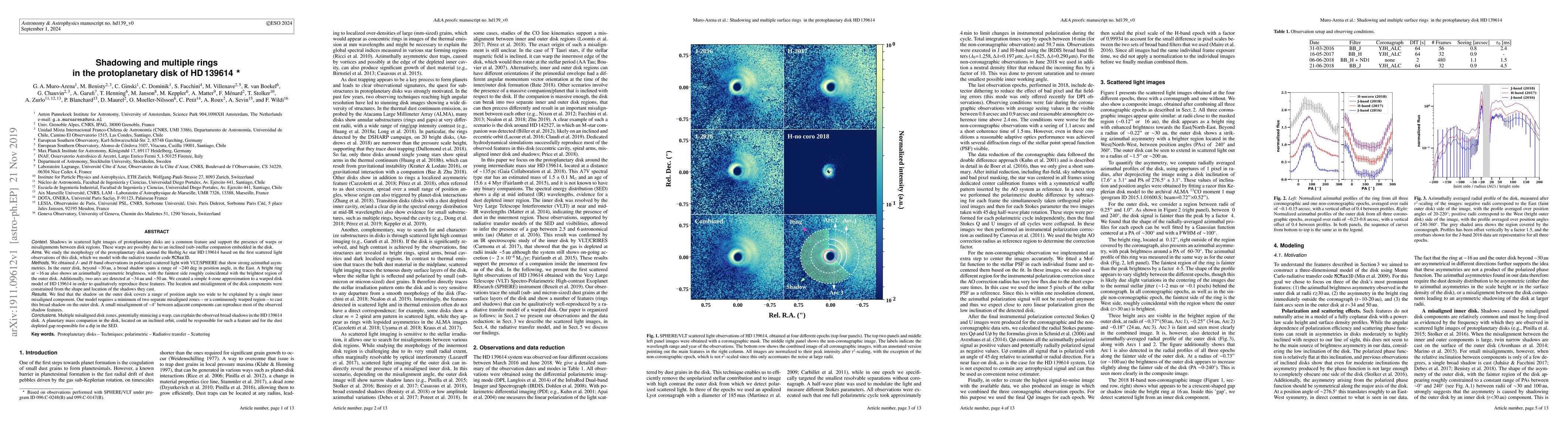 Shadows in scattered light images of protoplanetary disks are a common feature and support the presence of warps or misalignments between disk regions. These warps are possibly due to an inclined (sub-)stellar companion embedded in the disk. We study the morphology of the protoplanetary disk around the Herbig Ae star HD 139614 based on the first scattered light observations of this disk, which we model with the radiative transfer code MCMax3D. We obtained J- and H-band observations in polarized scattered light with VLT/SPHERE that show strong azimuthal asymmetries. In the outer disk, beyond ~30 au, a broad shadow spans a range of ~240{\deg} in position angle, in the East. A bright ring at ~16 au also shows an azimuthally asymmetric brightness, with the faintest side roughly coincidental with the brightest region of the outer disk. Additionally, two arcs are detected at ~34 au and ~50 au. We created a simple 4-zone approximation to a warped disk model of HD 139614 in order to qualitatively reproduce these features. The location and misalignment of the disk components were constrained from the shape and location of the shadows they cast. We find that the shadow on the outer disk covers a range of position angle too wide to be explained by a single inner misaligned component. Our model requires a minimum of two separate misaligned zones -- or a continuously warped region -- to cast this broad shadow on the outer disk. A small misalignment of ~4{\deg} between adjacent components can reproduce most of the observed shadow features. Multiple misaligned disk zones, potentially mimicing a warp, can explain the observed broad shadows in the HD 139614 disk. A planetary mass companion in the disk, located on an inclined orbit, could be responsible for such a feature and for the dust depleted gap responsible for a dip in the SED.