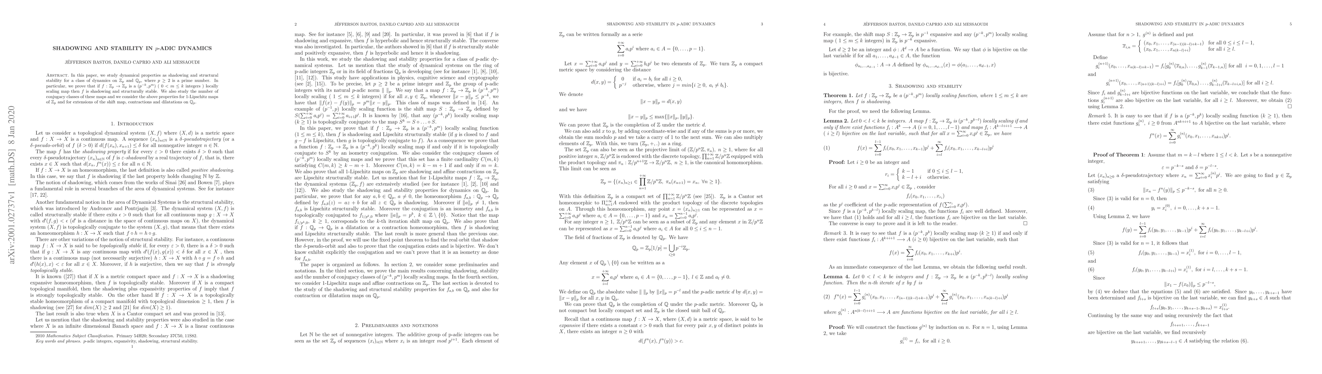 In this paper, we study dynamical properties as shadowing and structural stability for a class of dynamics on $\mathbb{Z}_p$ and $\mathbb{Q}_p$, where $p \geq 2$ is a prime number. In particular, we prove that if $f: \mathbb{Z}_p \to \mathbb{Z}_p$ is a $(p^{-k},p^{m})$ ( $0 < m \leq k$ integers ) locally scaling map then $f$ is shadowing and structurally stable. We also study the number of conjugacy classes of these maps and we consider the above properties for $1$-Lipschitz maps of $\mathbb{Z}_p$ and for extensions of the shift map, contractions and dilatations on $\mathbb{Q}_p$.