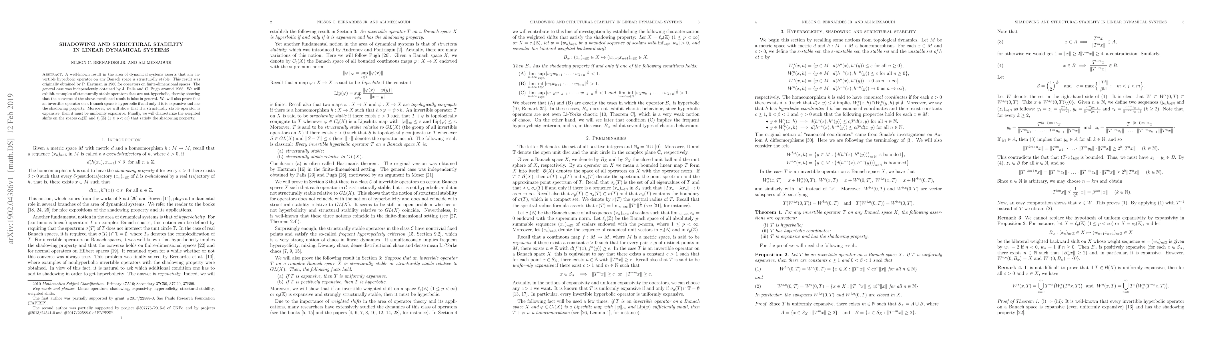 A well-known result in the area of dynamical systems asserts that any invertible hyperbolic operator on any Banach space is structurally stable. This result was originally obtained by P. Hartman in 1960 for operators on finite-dimensional spaces. The general case was independently obtained by J. Palis and C. Pugh around 1968. We will exhibit examples of structurally stable operators that are not hyperbolic, thereby showing that the converse of the above-mentioned result is false in general. We will also prove that an invertible operator on a Banach space is hyperbolic if and only if it is expansive and has the shadowing property. Moreover, we will show that if a structurally stable operator is expansive, then it must be uniformly expansive. Finally, we will characterize the weighted shifts on the spaces $c_0(\mathbb{Z})$ and $\ell_p(\mathbb{Z})$ ($1 \leq p < \infty$) that satisfy the shadowing property.