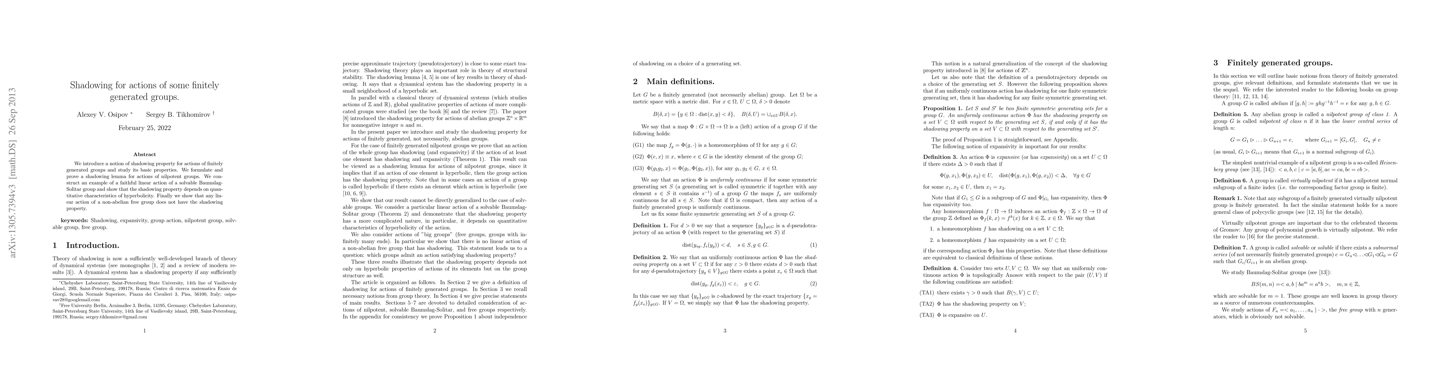 This paper introduces the shadowing property for actions of finitely generated groups, proving a shadowing lemma for nilpotent groups and demonstrating that the property depends on hyperbolicity characteristics. It also constructs an example of a solvable Baumslag-Solitar group and concludes that linear actions of non-abelian free groups lack this property.
