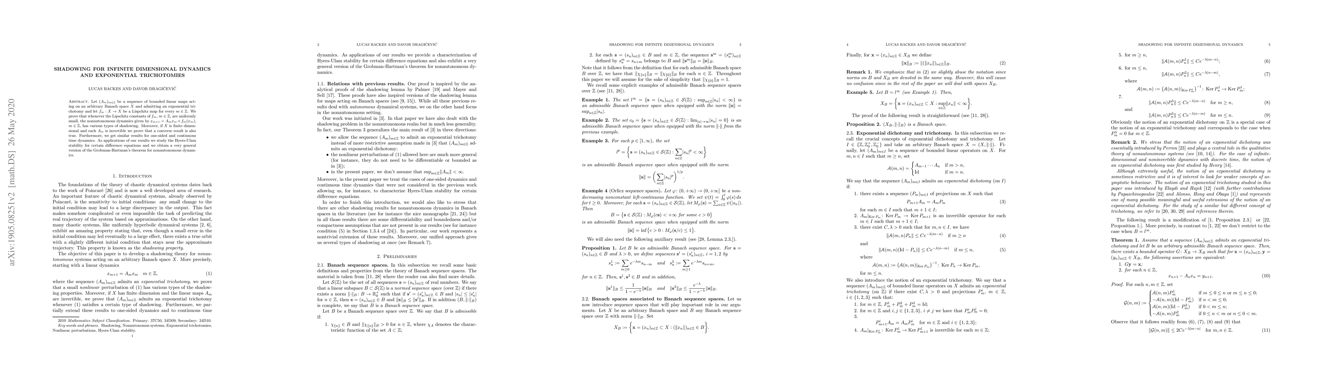 This paper proves shadowing properties for nonautonomous dynamics in infinite dimensional Banach spaces under conditions of exponential trichotomy and uniformly small Lipschitz constants. It also establishes a converse result for finite dimensional cases and extends findings to continuous time dynamics, with applications to Hyers-Ulam stability and a generalized Grobman-Hartman theorem.