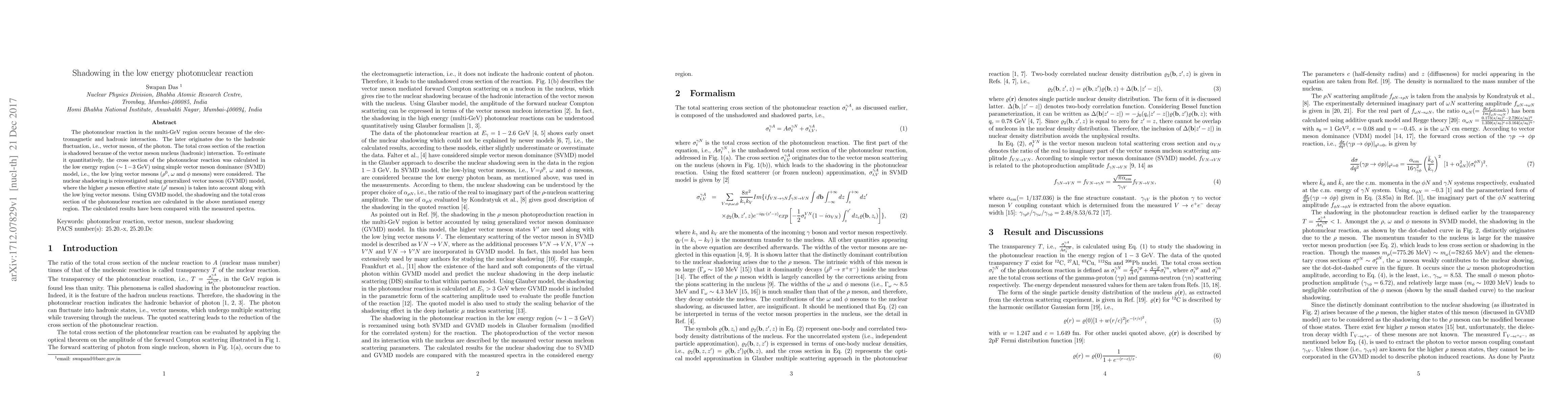 This paper investigates the shadowing effect in low energy photonuclear reactions, attributing it to hadronic interactions from vector meson fluctuations. It uses the generalized vector meson dominance model to calculate the total cross section and nuclear shadowing, comparing results with measured spectra.