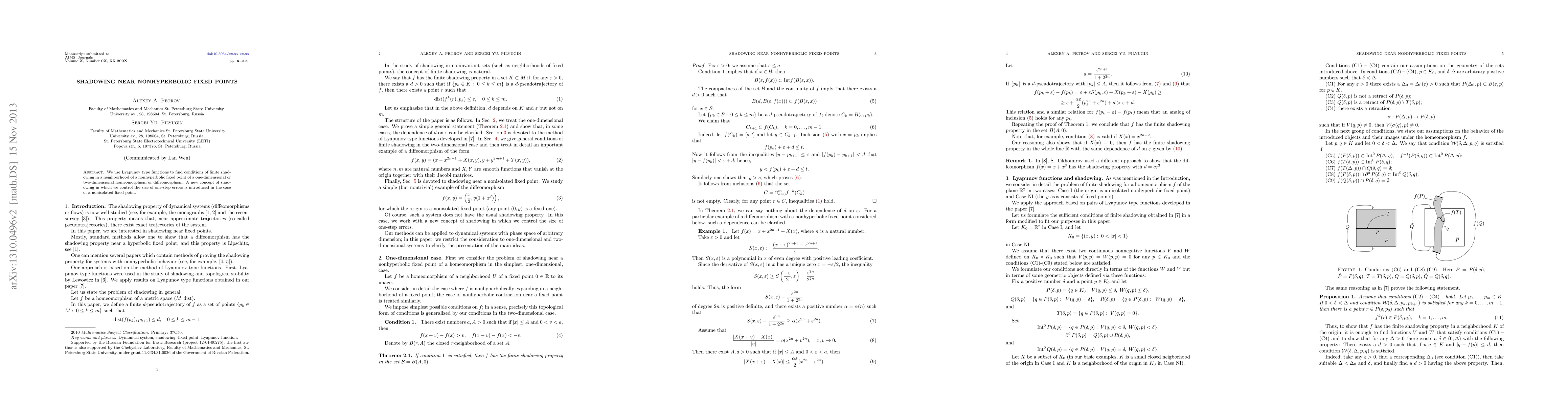 Summary: This paper explores the conditions for finite shadowing near nonhyperbolic fixed points using Lyapunov type functions, introducing a new concept of shadowing that controls the size of one-step errors, particularly for nonisolated fixed points in one- or two-dimensional homeomorphisms or diffeomorphisms.