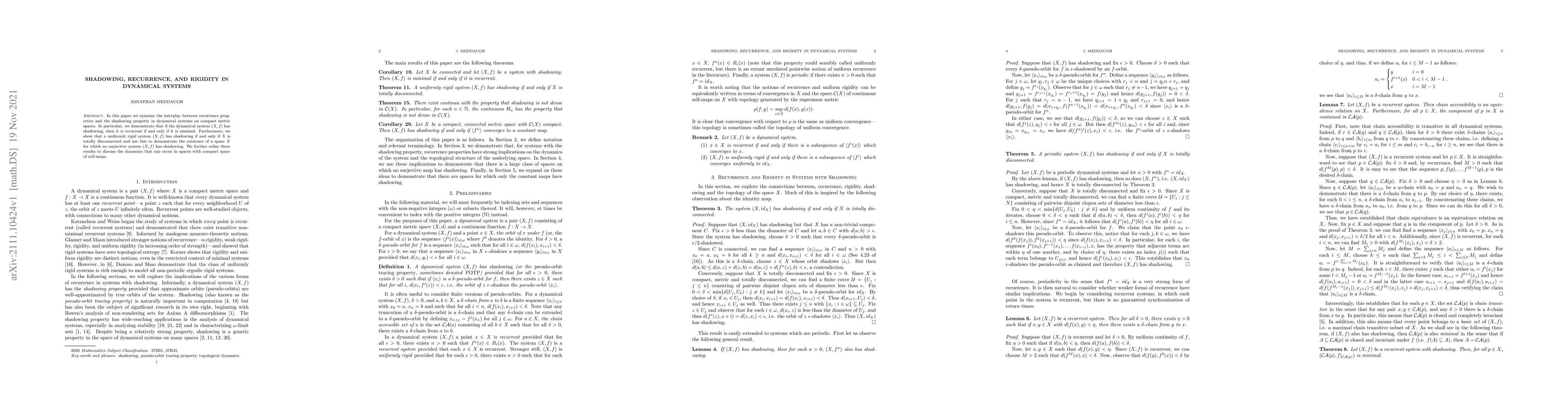 This paper investigates the relationship between recurrence and shadowing properties in dynamical systems, proving that a system with shadowing is recurrent if and only if it is minimal. It also establishes that uniformly rigid systems with shadowing must be totally disconnected and demonstrates the non-existence of surjective systems with shadowing in certain spaces. The study further explores the dynamics in compact spaces of self-maps.