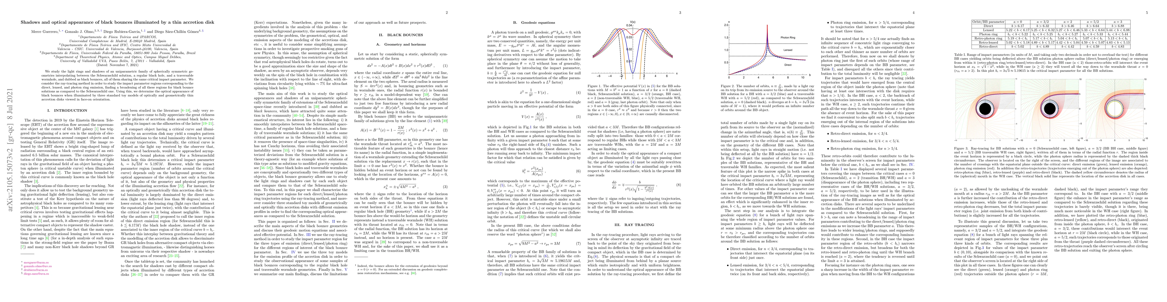 We study the light rings and shadows of an uniparametric family of spherically symmetric geometries interpolating between the Schwarzschild solution, a regular black hole, and a traversable wormhole, and dubbed as black bounces, all of them sharing the same critical impact parameter. We consider the ray-tracing method in order to study the impact parameter regions corresponding to the direct, lensed, and photon ring emission, finding a broadening of all these regions for black bounce solutions as compared to the Schwarzschild one. Using this, we determine the optical appearance of black bounces when illuminated by three standard toy models of optically and geometrically thin accretion disks viewed in face-on orientation.