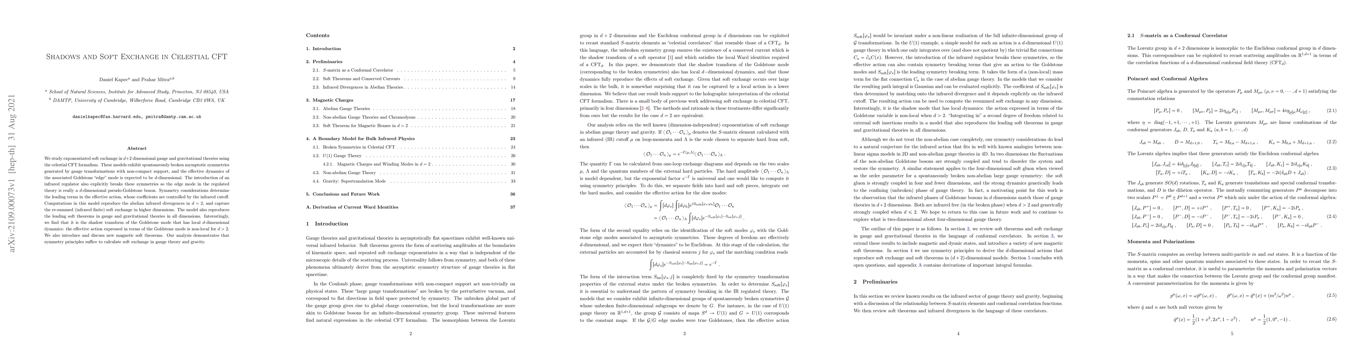 We study exponentiated soft exchange in $d+2$ dimensional gauge and gravitational theories using the celestial CFT formalism. These models exhibit spontaneously broken asymptotic symmetries generated by gauge transformations with non-compact support, and the effective dynamics of the associated Goldstone "edge" mode is expected to be $d$-dimensional. The introduction of an infrared regulator also explicitly breaks these symmetries so the edge mode in the regulated theory is really a $d$-dimensional pseudo-Goldstone boson. Symmetry considerations determine the leading terms in the effective action, whose coefficients are controlled by the infrared cutoff. Computations in this model reproduce the abelian infrared divergences in $d=2$, and capture the re-summed (infrared finite) soft exchange in higher dimensions. The model also reproduces the leading soft theorems in gauge and gravitational theories in all dimensions. Interestingly, we find that it is the shadow transform of the Goldstone mode that has local $d$-dimensional dynamics: the effective action expressed in terms of the Goldstone mode is non-local for $d>2$. We also introduce and discuss new magnetic soft theorems. Our analysis demonstrates that symmetry principles suffice to calculate soft exchange in gauge theory and gravity.
