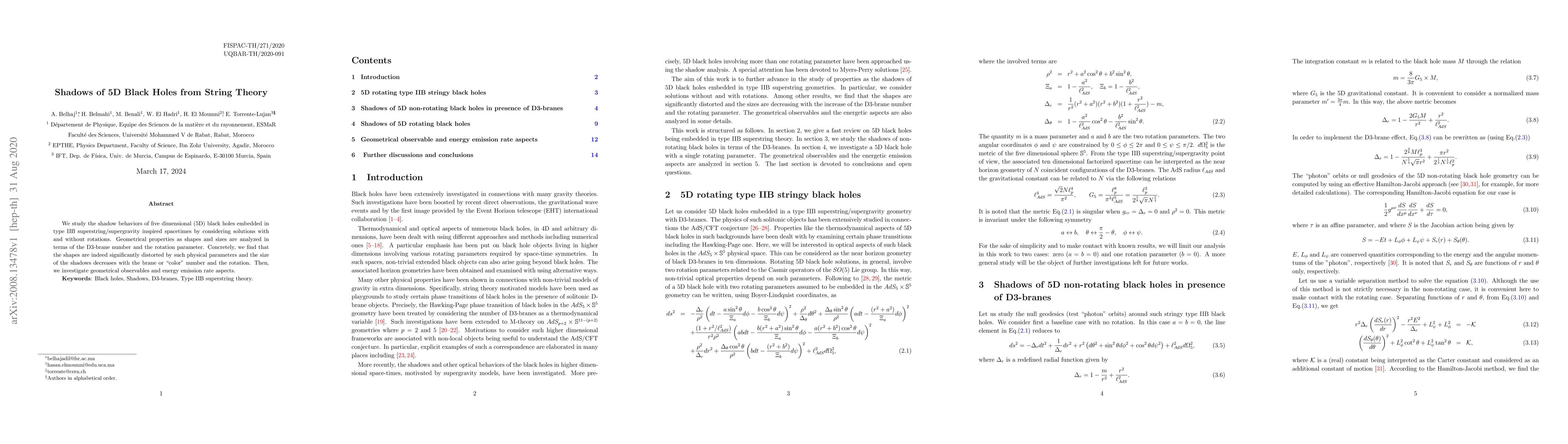 We study the shadow behaviors of five dimensional (5D) black holes embedded in type IIB superstring/supergravity inspired spacetimes by considering solutions with and without rotations. Geometrical properties as shapes and sizes are analyzed in terms of the D3-brane number and the rotation parameter. Concretely, we find that the shapes are indeed significantly distorted by such physical parameters and the size of the shadows decreases with the brane or "color" number and the rotation. Then, we investigate geometrical observables and energy emission rate aspects.