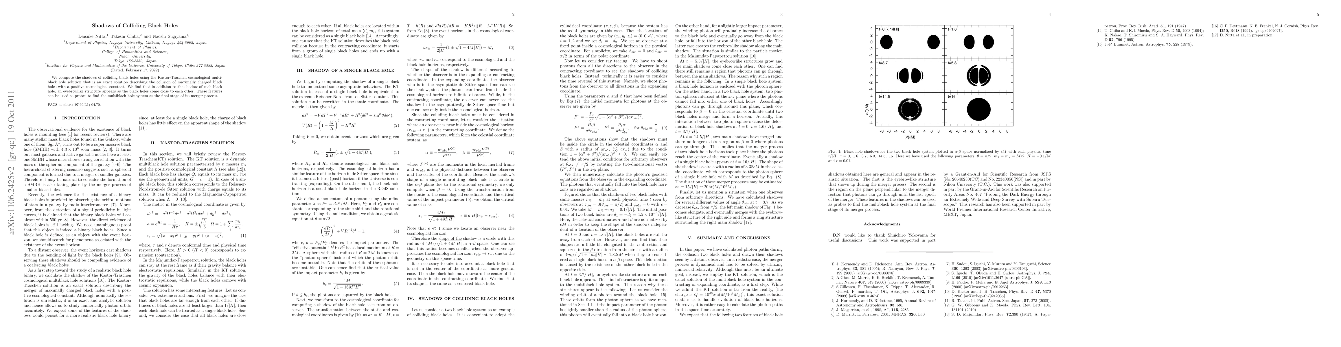 This study computes the shadows of colliding black holes using the Kastor-Traschen solution, revealing an eyebrowlike structure alongside each black hole's shadow as they merge. These features can serve as indicators for detecting multiblack hole systems during their merger.