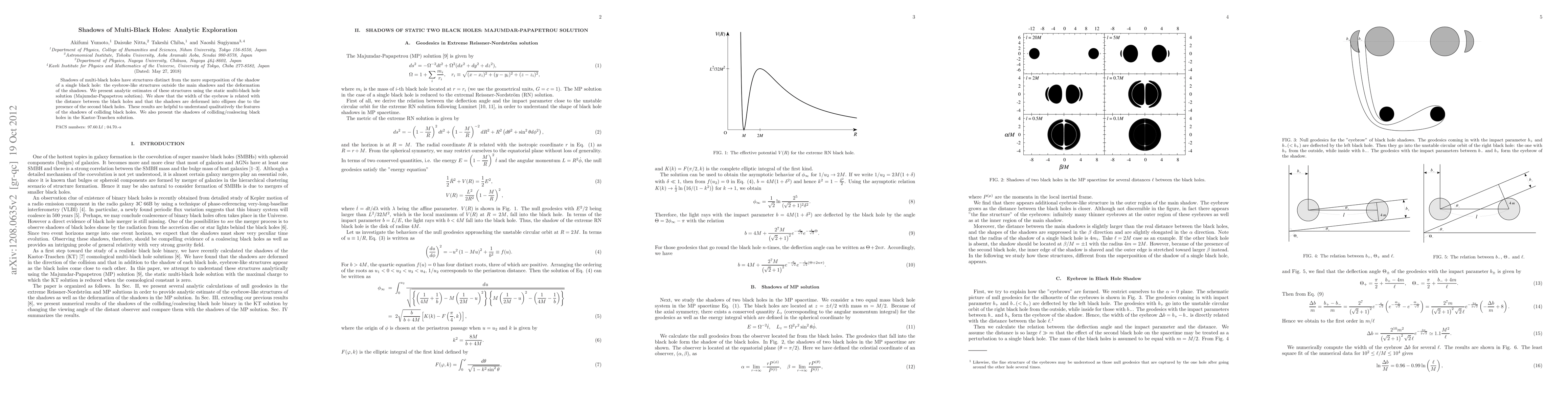 This paper analytically explores the distinct shadow structures of multi-black holes, revealing eyebrow-like features and elliptical deformations due to the interaction between black holes. The study uses the Majumdar-Papapetrou solution to show that the shadow width correlates with the black hole separation, aiding in understanding the qualitative features of colliding black holes.