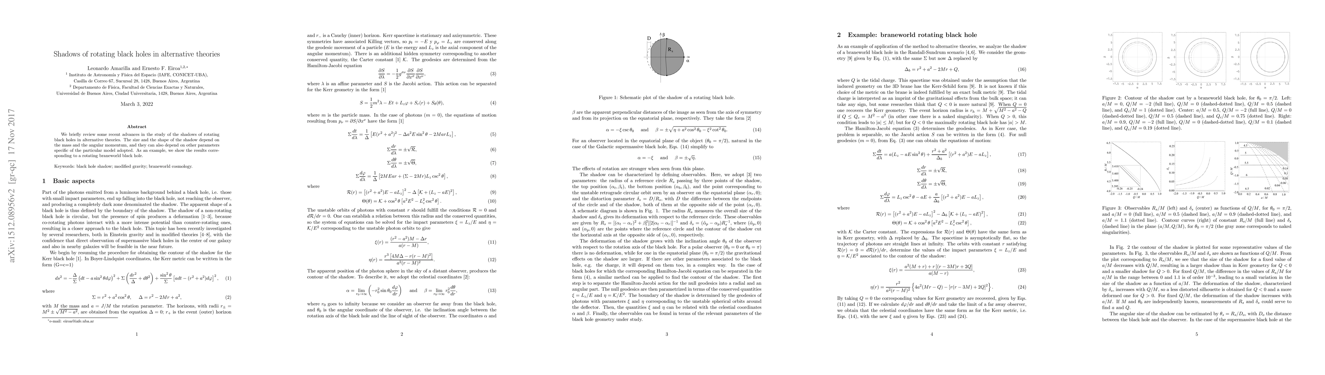 We briefly review some recent advances in the study of the shadows of rotating black holes in alternative theories. The size and the shape of the shadow depend on the mass and the angular momentum, and they can also depend on other parameters specific of the particular model adopted. As an example, we show the results corresponding to a rotating braneworld black hole.