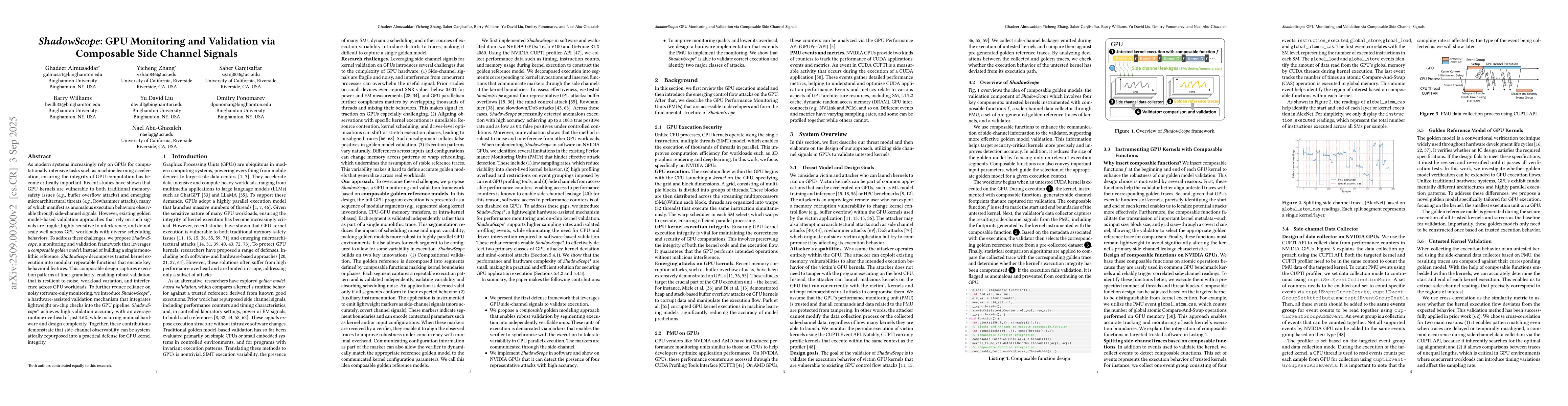 As modern systems increasingly rely on GPUs for computationally intensive tasks such as machine learning acceleration, ensuring the integrity of GPU computation has become critically important. Recent studies have shown that GPU kernels are vulnerable to both traditional memory safety issues (e.g., buffer overflow attacks) and emerging microarchitectural threats (e.g., Rowhammer attacks), many of which manifest as anomalous execution behaviors observable through side-channel signals. However, existing golden model based validation approaches that rely on such signals are fragile, highly sensitive to interference, and do not scale well across GPU workloads with diverse scheduling behaviors. To address these challenges, we propose ShadowScope, a monitoring and validation framework that leverages a composable golden model. Instead of building a single monolithic reference, ShadowScope decomposes trusted kernel execution into modular, repeatable functions that encode key behavioral features. This composable design captures execution patterns at finer granularity, enabling robust validation that is resilient to noise, workload variation, and interference across GPU workloads. To further reduce reliance on noisy software-only monitoring, we introduce ShadowScope+, a hardware-assisted validation mechanism that integrates lightweight on-chip checks into the GPU pipeline. ShadowScope+ achieves high validation accuracy with an average runtime overhead of just 4.6%, while incurring minimal hardware and design complexity. Together, these contributions demonstrate that side-channel observability can be systematically repurposed into a practical defense for GPU kernel integrity.
