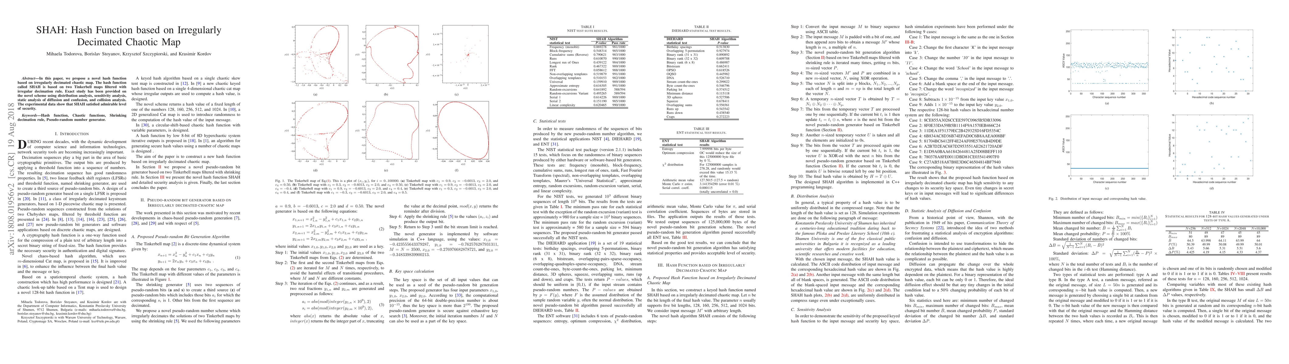 The paper introduces SHAH, a novel hash function based on irregularly decimated chaotic Tinkerbell maps, demonstrating strong security through rigorous distribution, sensitivity, and collision analyses. Experimental results show SHAH achieves an admirable level of security.