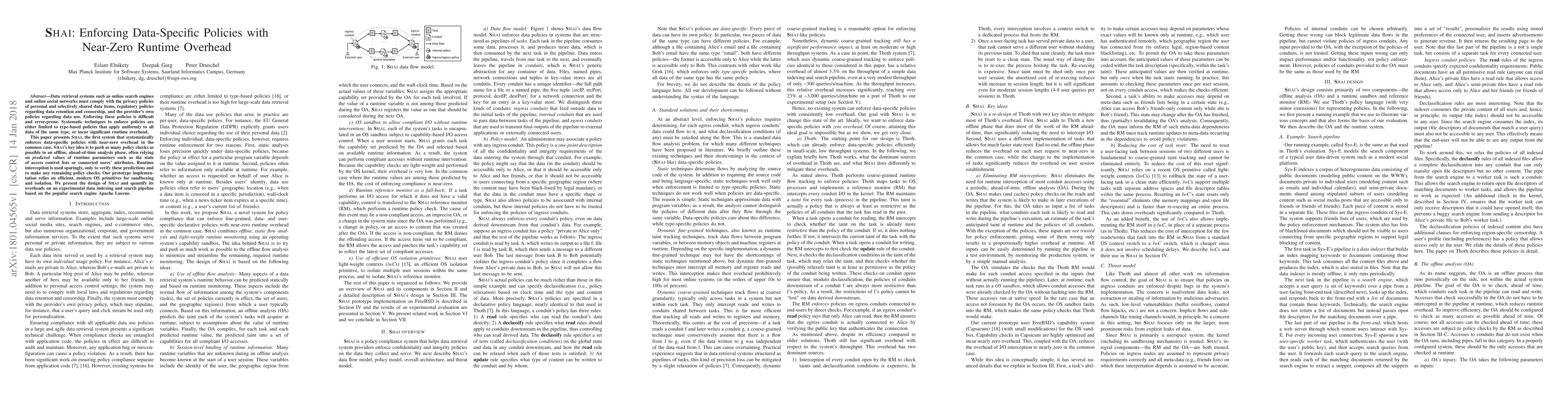 This paper introduces Shai, a novel system for enforcing data-specific policies with minimal runtime overhead. Shai achieves this by performing most policy checks during an offline analysis phase, using runtime interception only for final verifications, thereby minimizing performance impact.