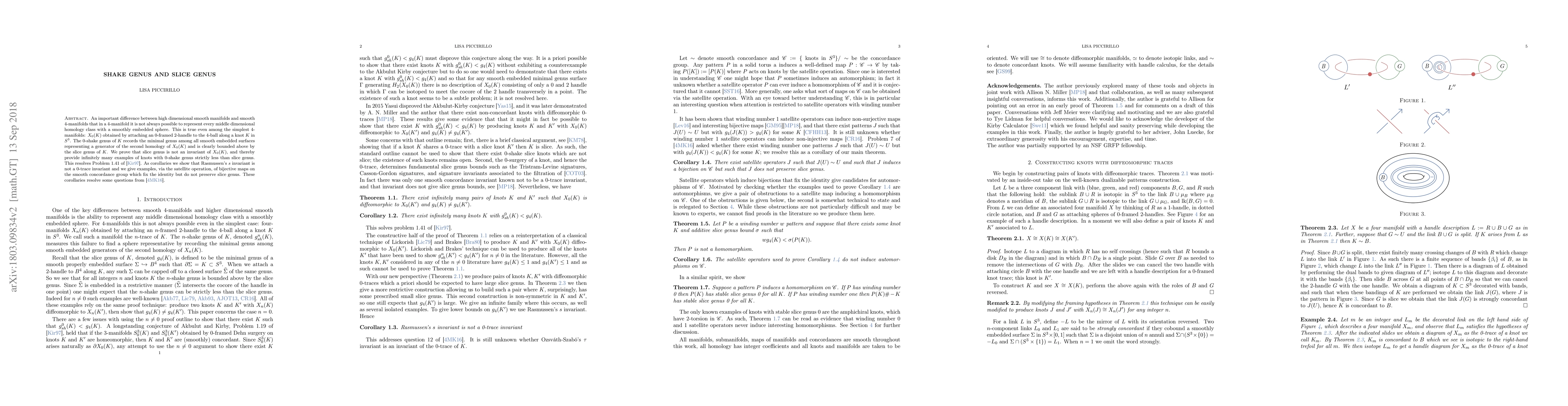 An important difference between high dimensional smooth manifolds and smooth 4-manifolds that in a 4-manifold it is not always possible to represent every middle dimensional homology class with a smoothly embedded sphere. This is true even among the simplest 4-manifolds: $X_0(K)$ obtained by attaching an $0$-framed 2-handle to the 4-ball along a knot $K$ in $S^3$. The $0$-shake genus of $K$ records the minimal genus among all smooth embedded surfaces representing a generator of the second homology of $X_0(K)$ and is clearly bounded above by the slice genus of $K$. We prove that slice genus is not an invariant of $X_0(K)$, and thereby provide infinitely many examples of knots with $0$-shake genus strictly less than slice genus. This resolves Problem 1.41 of [Kir97]. As corollaries we show that Rasmussen's $s$ invariant is not a $0$-trace invariant and we give examples, via the satellite operation, of bijective maps on the smooth concordance group which fix the identity but do not preserve slice genus. These corollaries resolve some questions from [4MKC16].