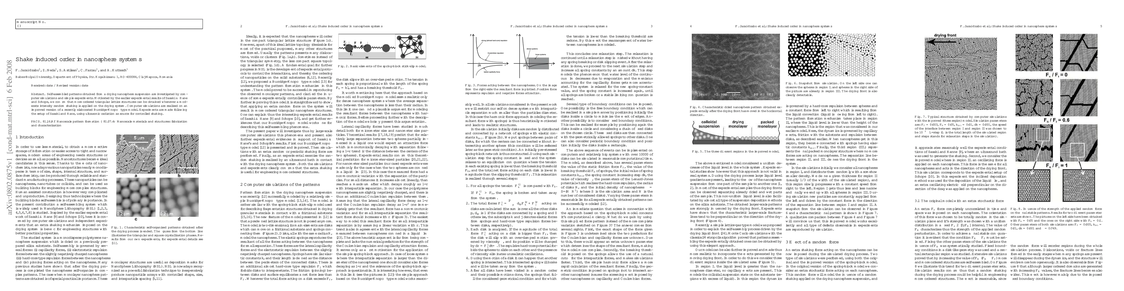 Self-assembled patterns obtained from a drying nanosphere suspension are investigated by computer simulations and simple experiments. Motivated by the earlier experimental results of Sasaki and Hane and Schope, we confirm that more ordered triangular lattice structures can be obtained whenever a moderate intensity random shaking is applied on the drying system. Computer simulations are realized on an improved version of a recently elaborated Burridge-Knopoff-type model. Experiments are made following the setup of Sasaki and Hane, using ultrasonic radiation as source for controlled shaking.