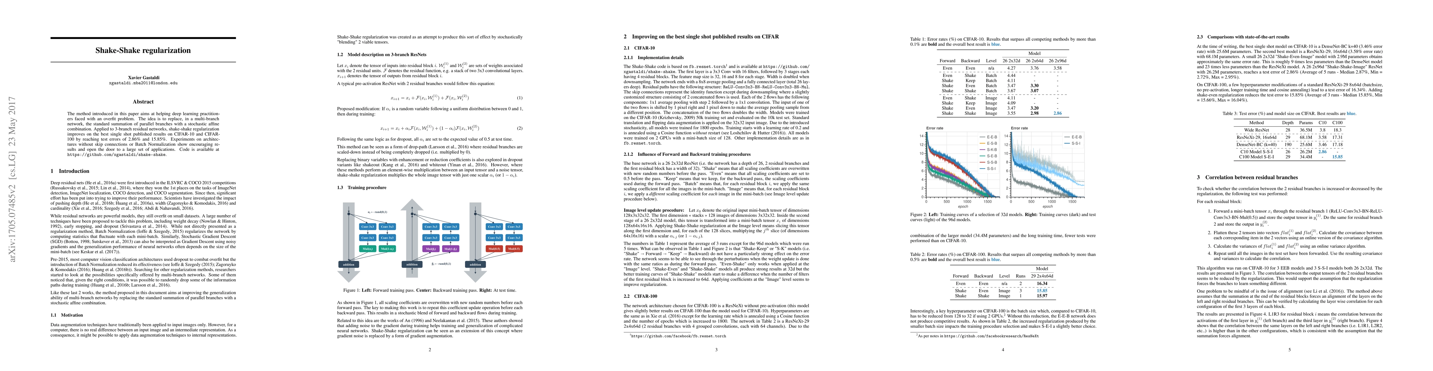 Shake-Shake regularization introduces a stochastic affine combination in multi-branch networks to combat overfitting, achieving state-of-the-art results on CIFAR-10 and CIFAR-100. The method demonstrates effectiveness even in architectures without skip connections or Batch Normalization.
